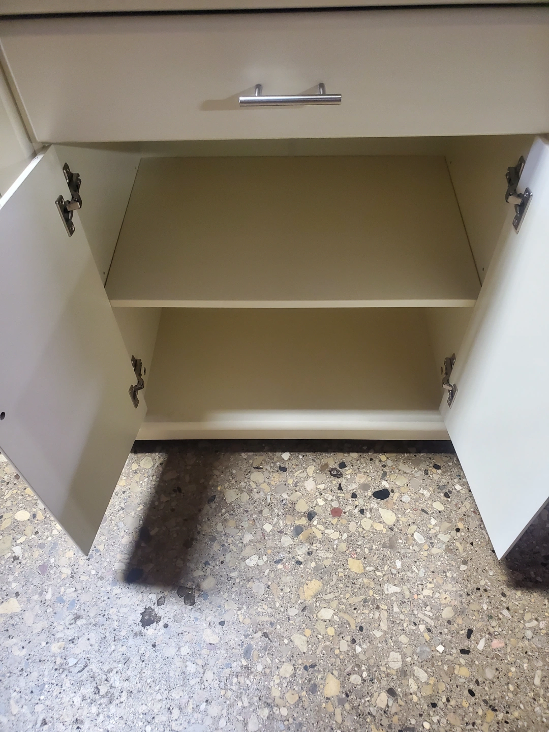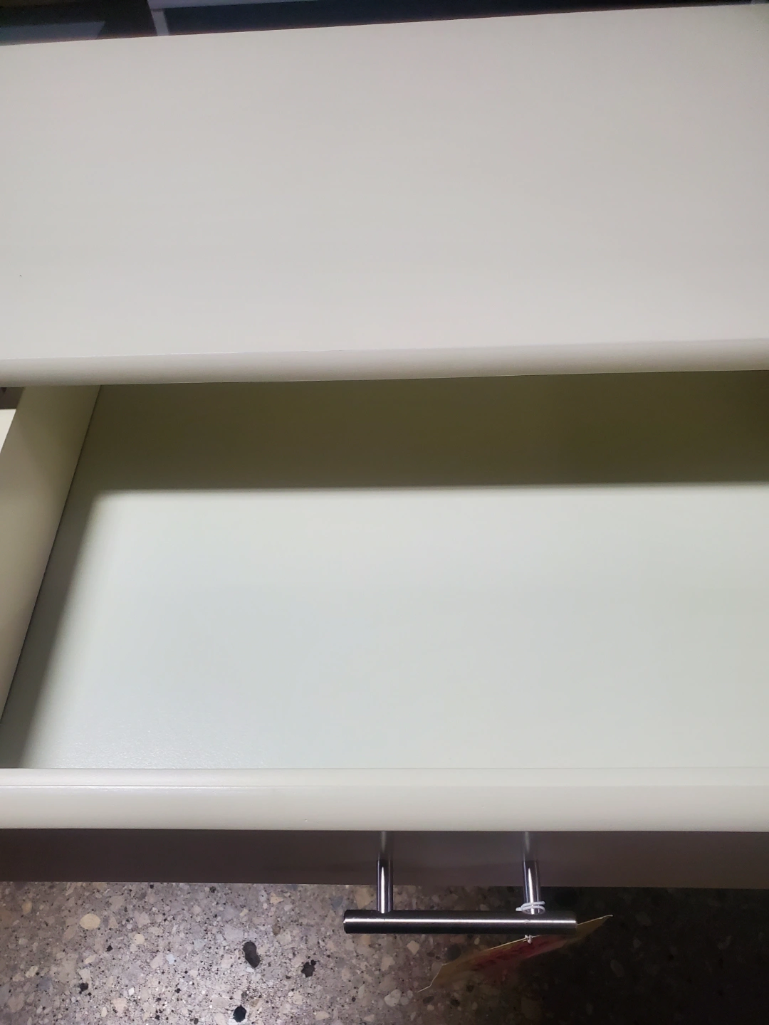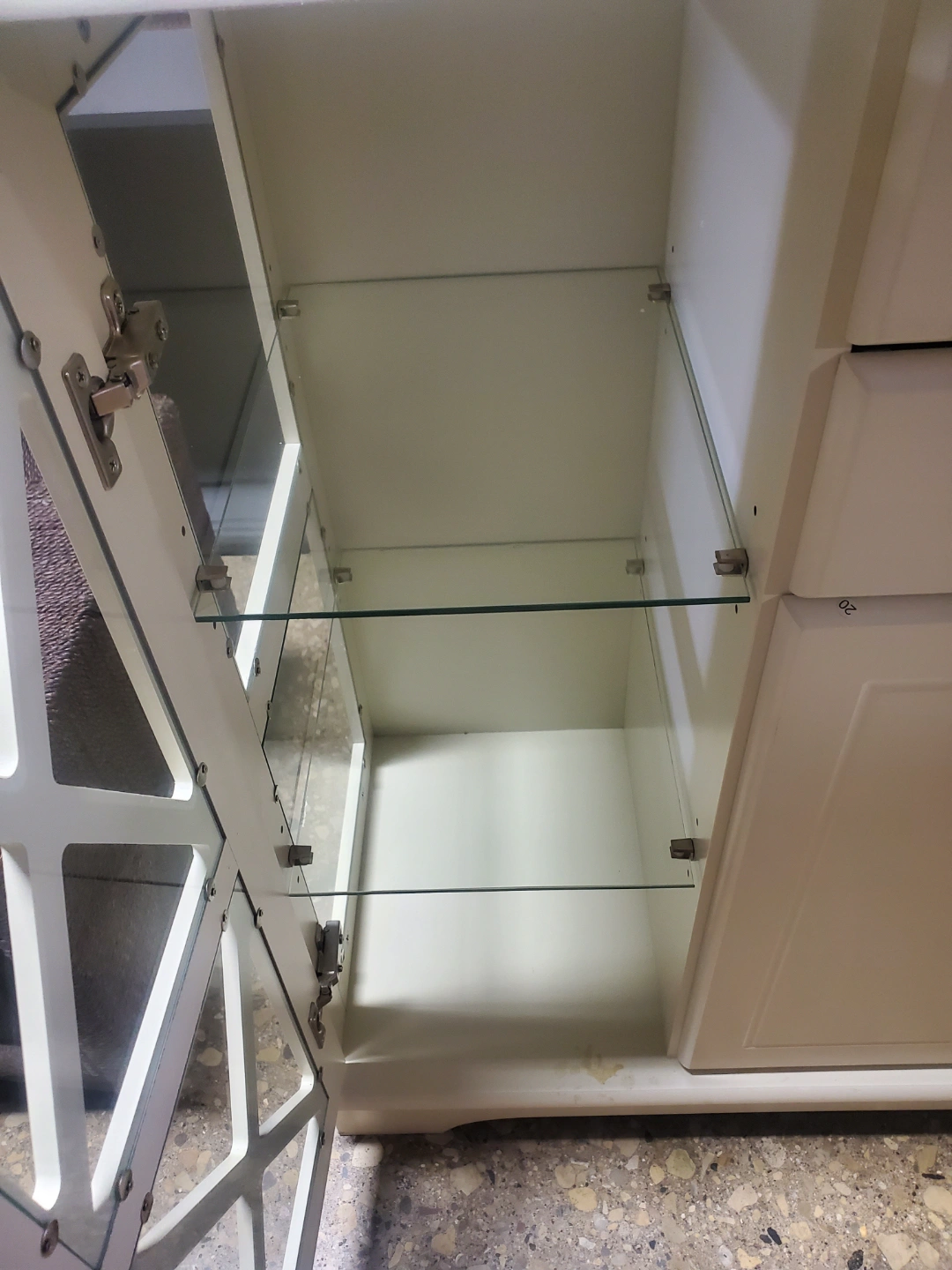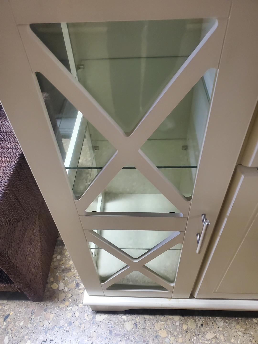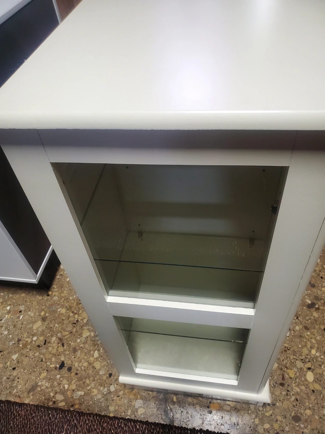 off White accent cabinet. Glass doors. Two doors with shelving. One drawer. Metal handles.