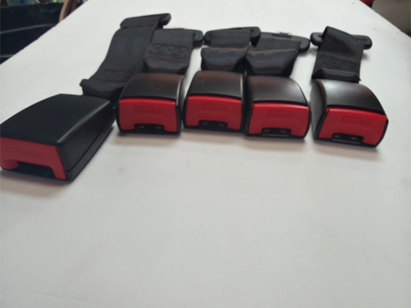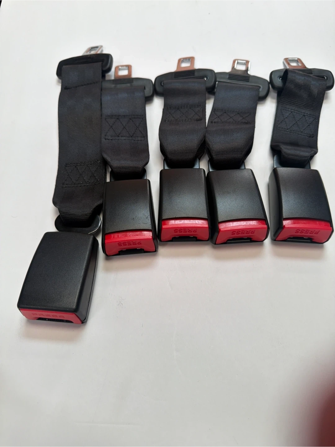 This set includes five black seat belt buckles, each featuring a red 'PRESS' release button. They're made of durable plastic and metal components. These buckles are designed for universal fit in vehicles. Great for replacements or custom installations!