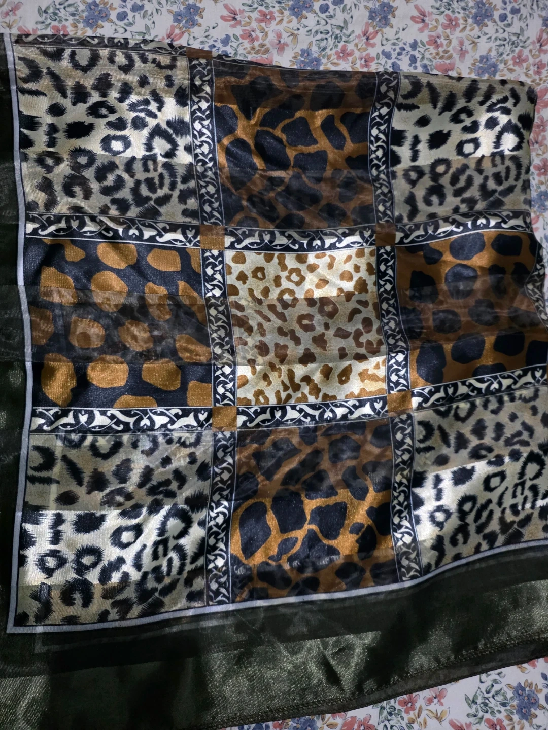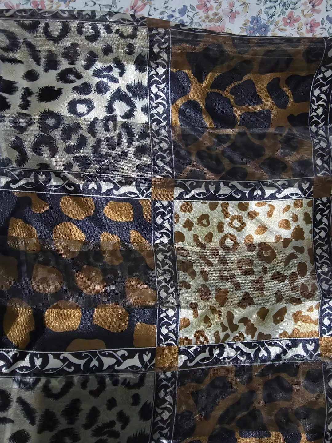 This scarf features a vibrant leopard print design with alternating panels. It's made of a lightweight, shimmering material. Perfect for adding a bold accent to any outfit!