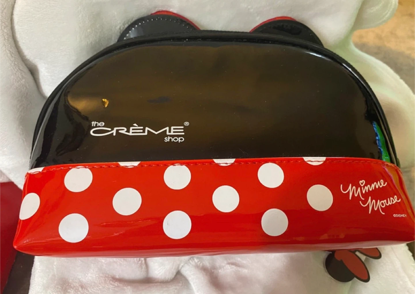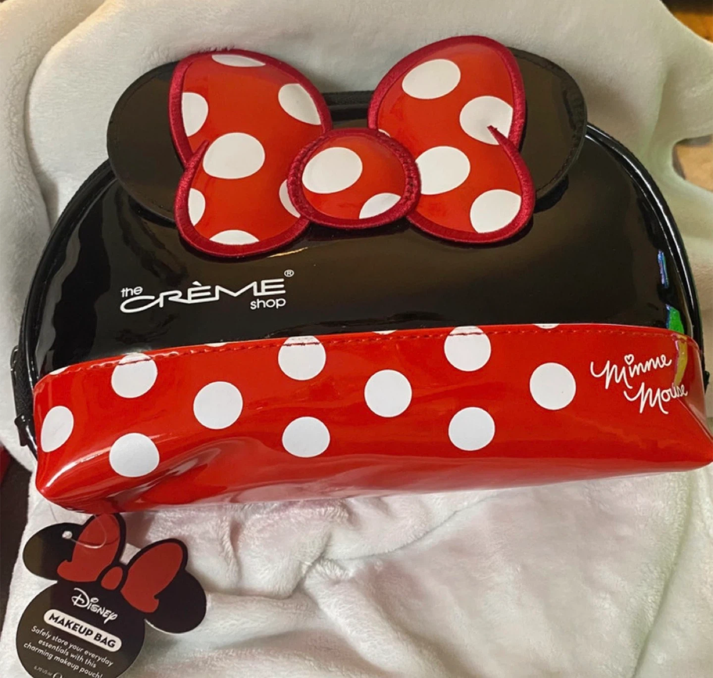 Make an offer … This is a Disney Minnie Mouse makeup bag from The Crème Shop. It features a black patent finish with a red and white polka dot trim and Minnie's signature bow. It's perfect for storing your everyday essentials or makeup.