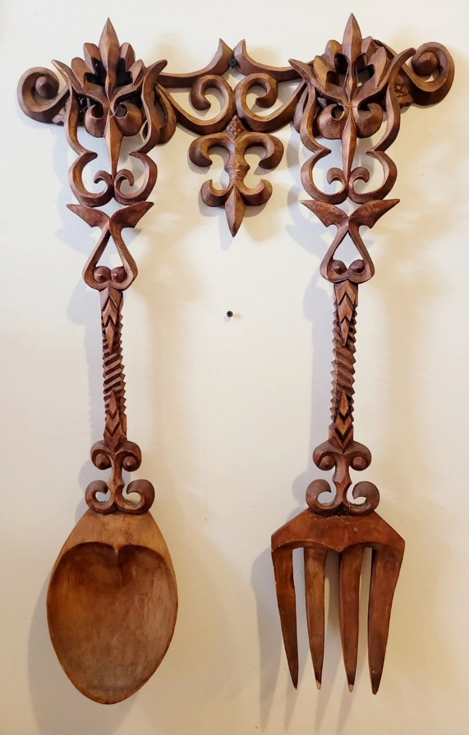 Hand Carved Wood Decorative Spoon and Fork Wall Hanging Set