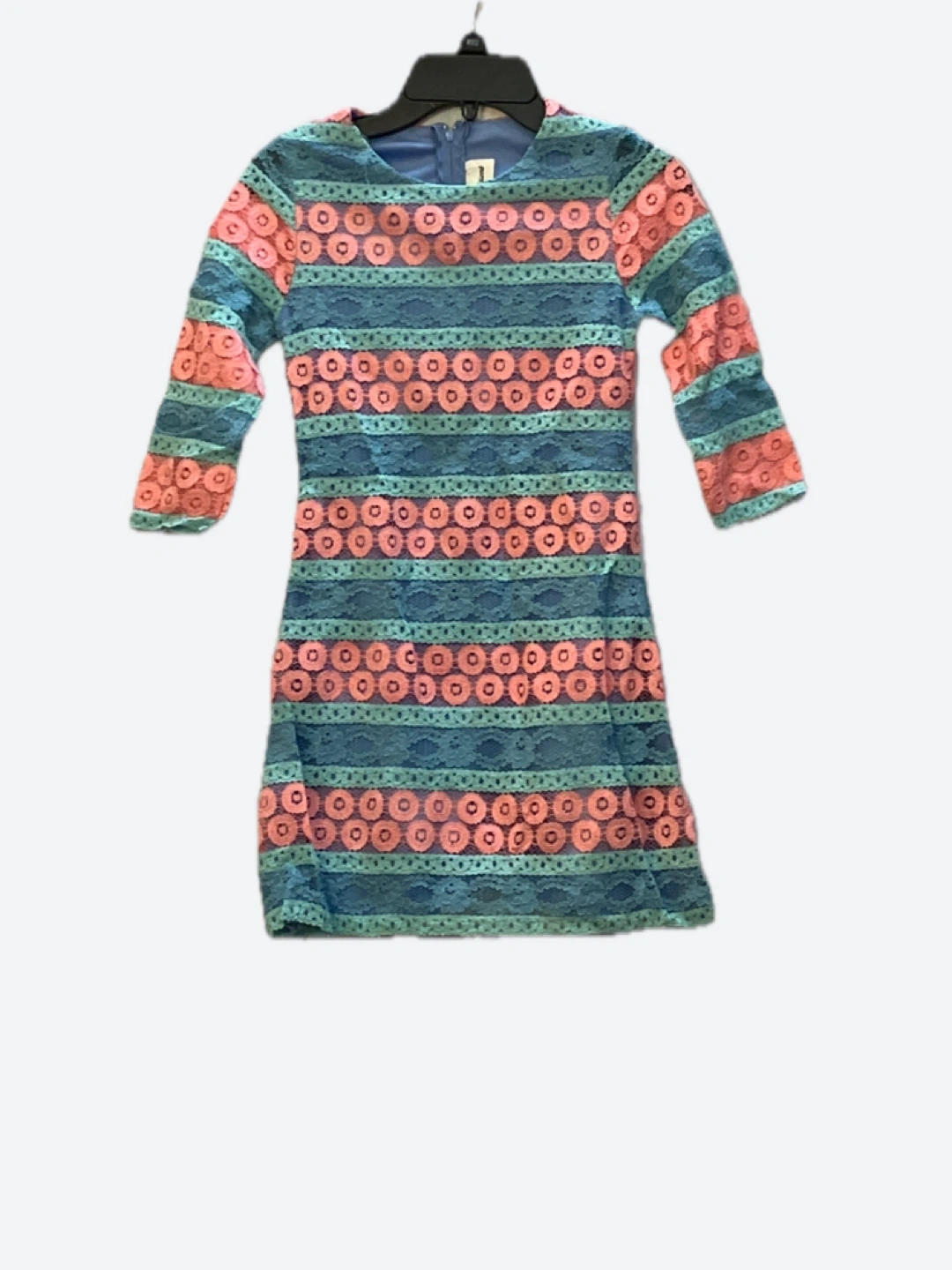 This girls' dress features a colorful striped lace pattern with coral and blue stripes. It has three-quarter length sleeves and a blue lining. It's perfect for parties or special occasions!