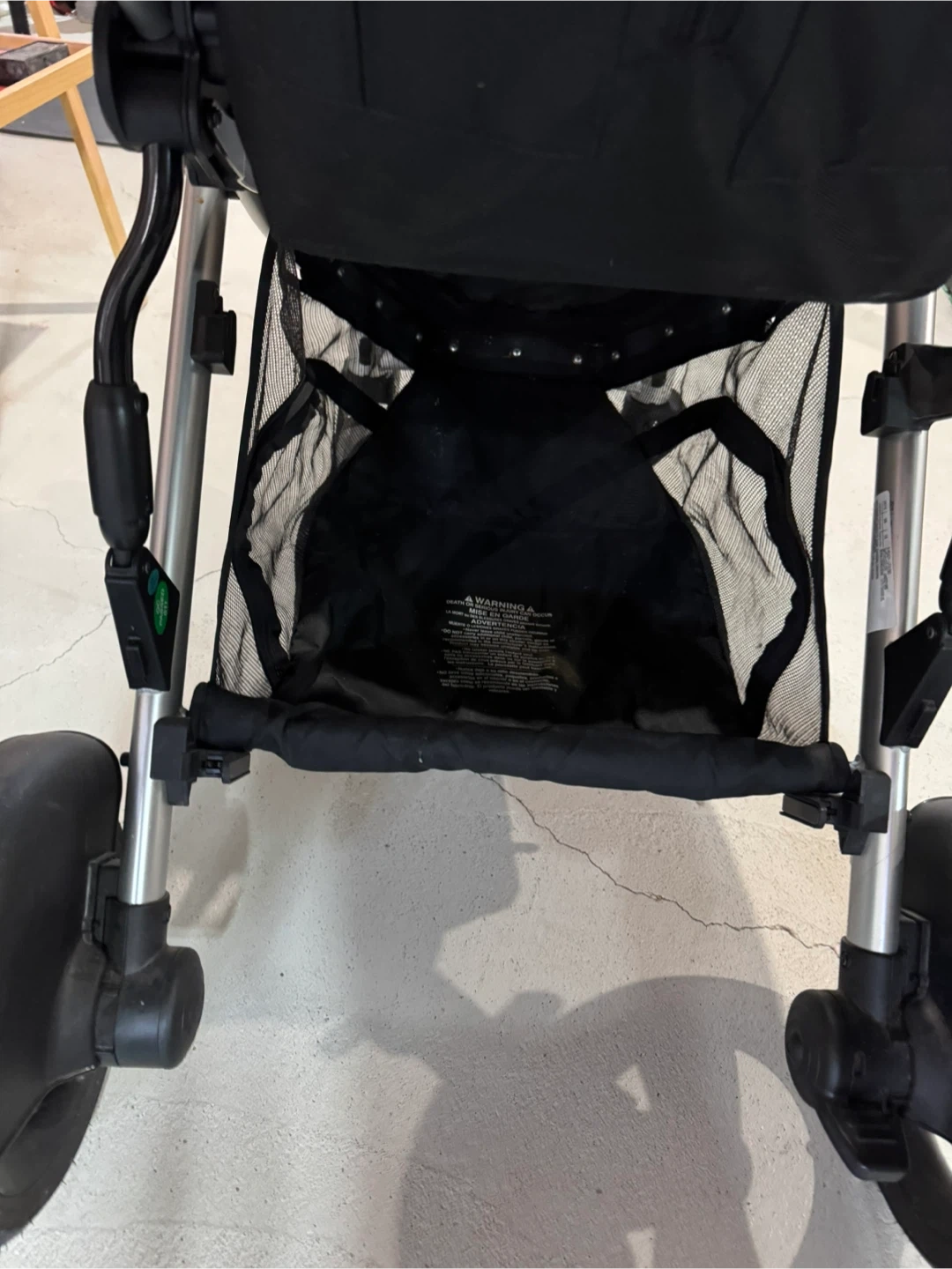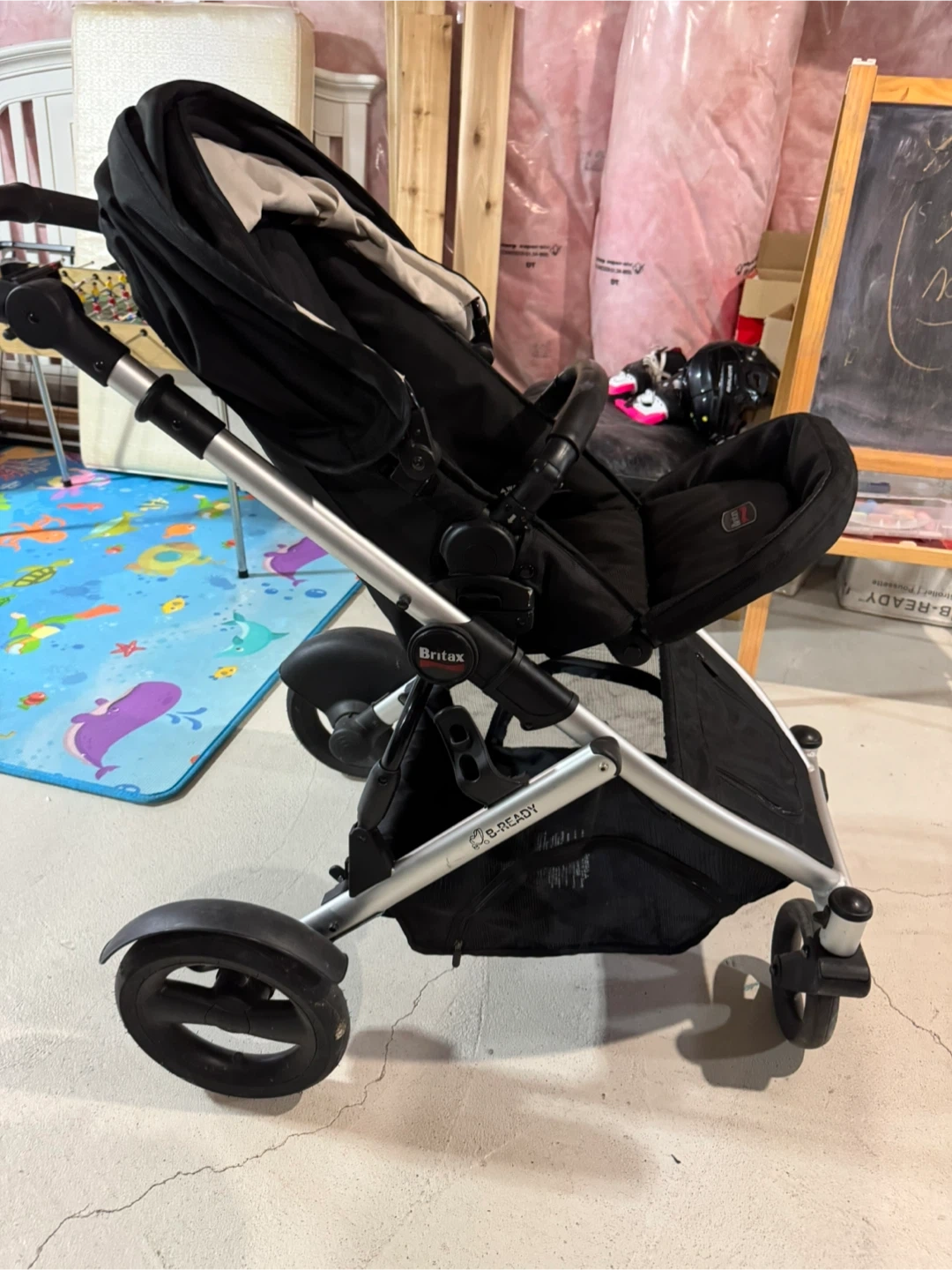 Black Britax B-Ready stroller with a large storage basket. It's a versatile stroller with a reversible seat and adjustable handle. Perfect for navigating city streets or park paths!