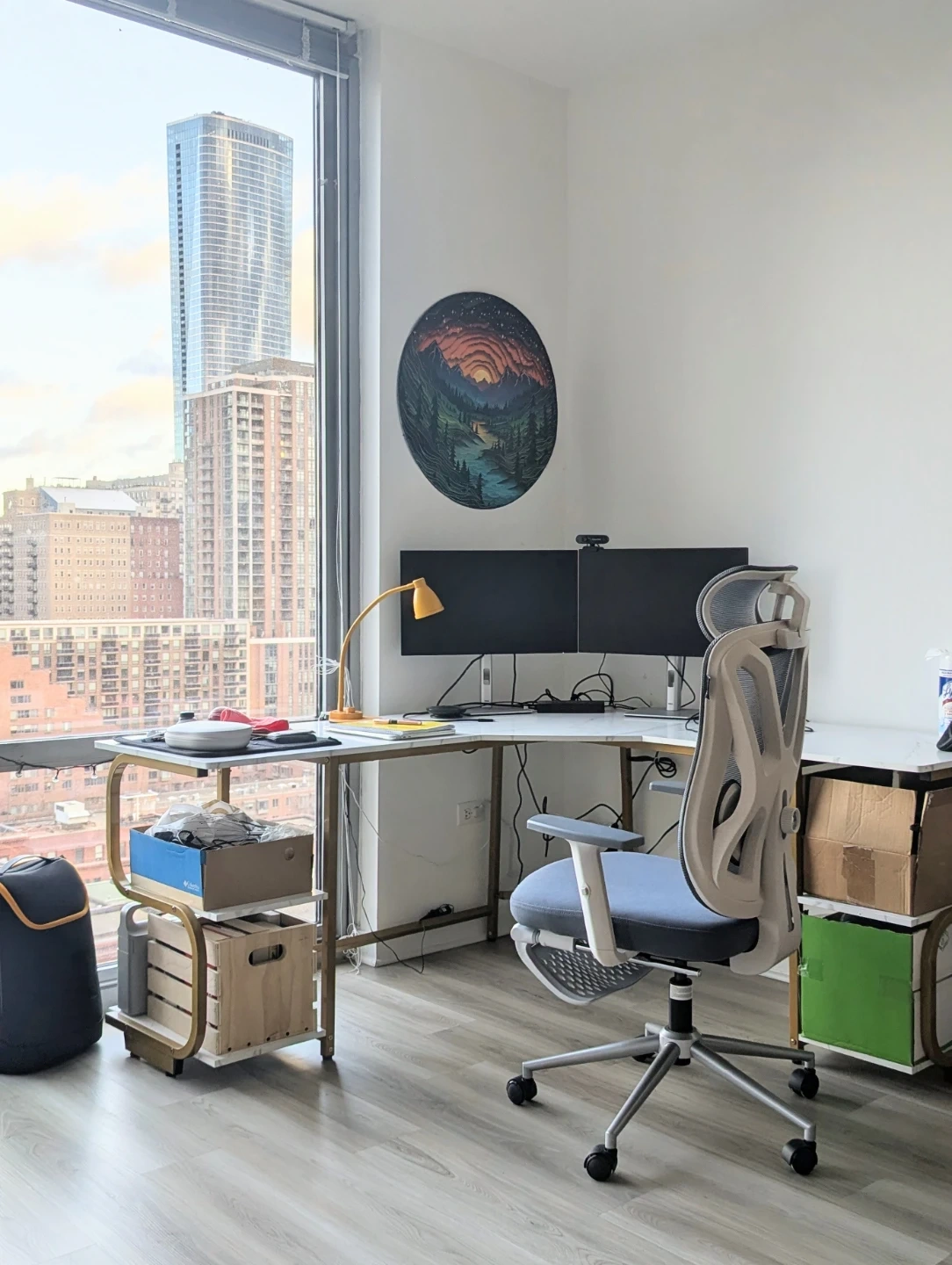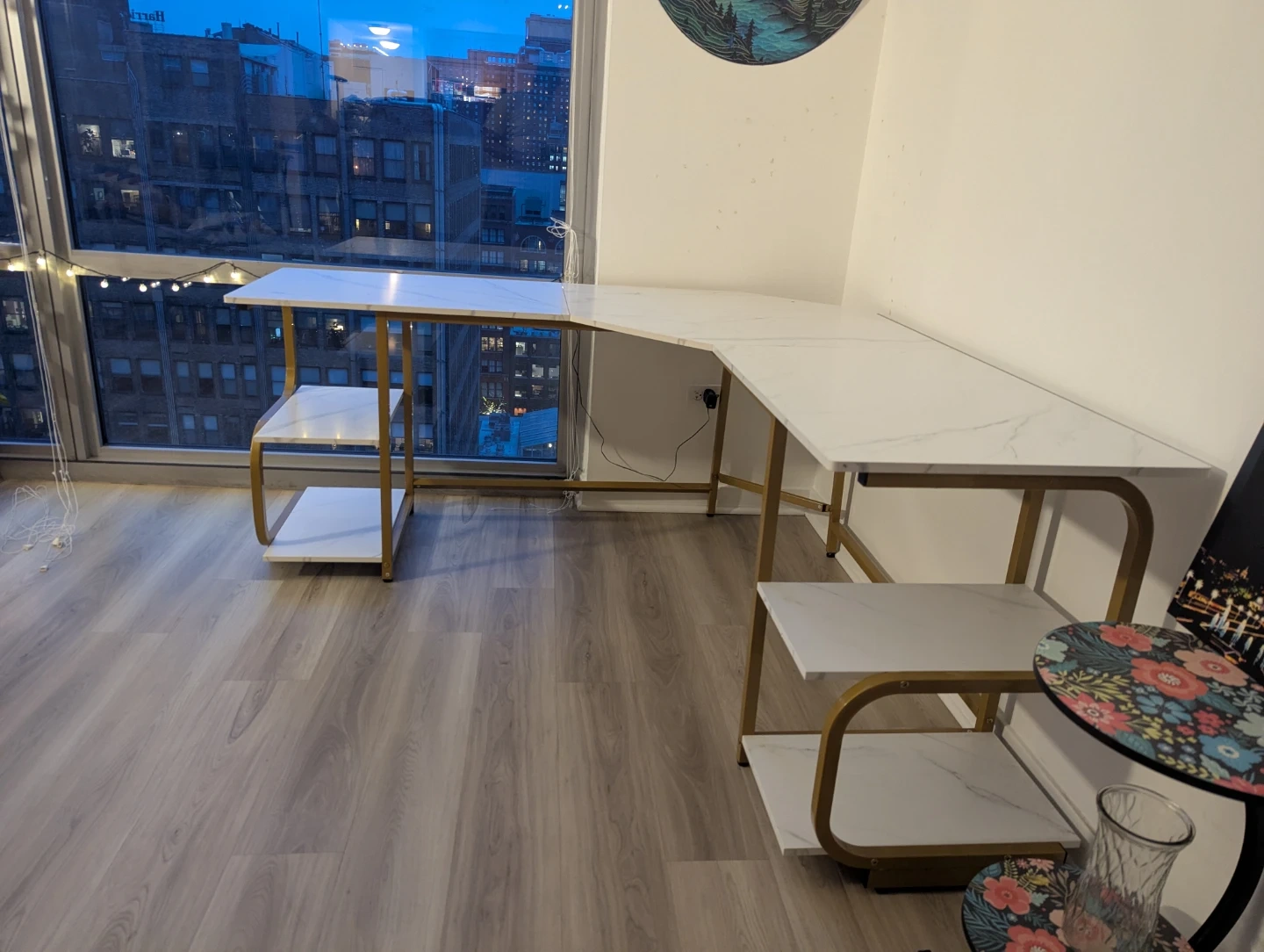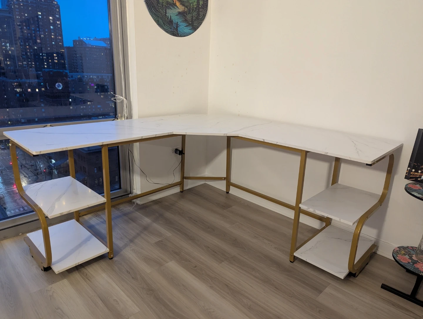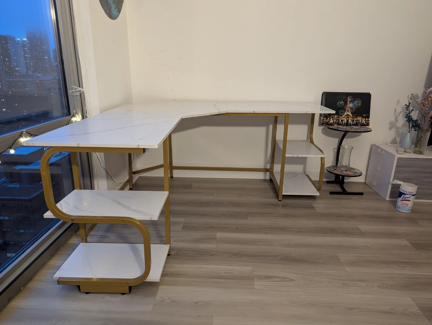 This L-shaped desk offers a lot of real estate for office work or gaming, is sturdy, has a white marble-finished surface with gold metal legs. Also has built in shelves on both ends. Selling because I moved to a smaller apartment but otherwise I love it