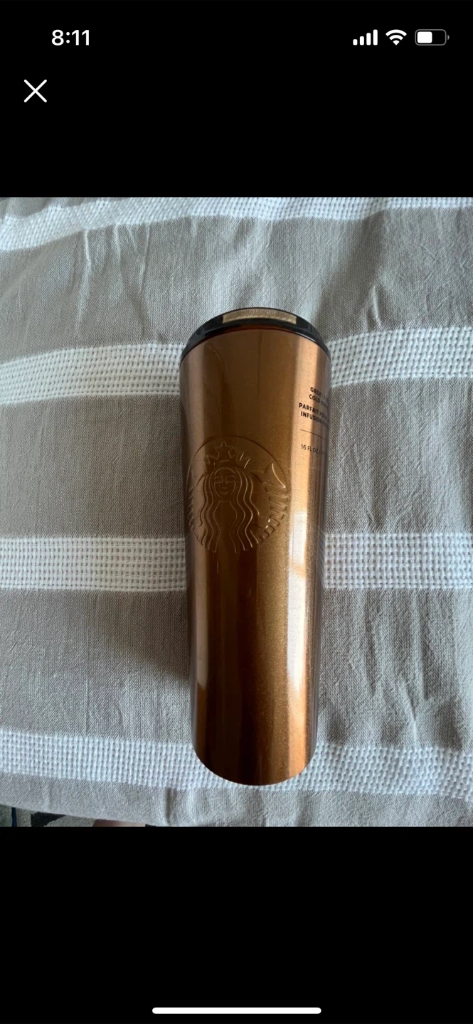 Here's a stylish Starbucks tumbler in a bronze color. It holds 16 fl oz and is great for hot or cold drinks! Perfect for infusions too