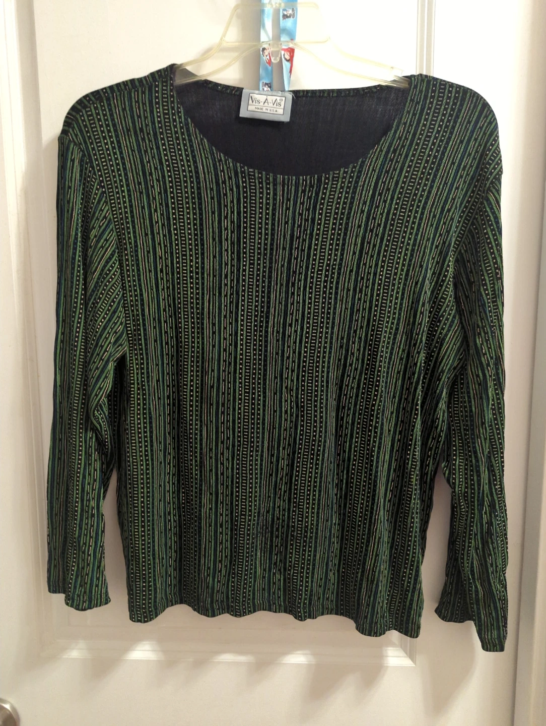 Vis-A-Vis women's long sleeve top with a vertical striped pattern. It features a black background with green and gold accents. Made in USA.
