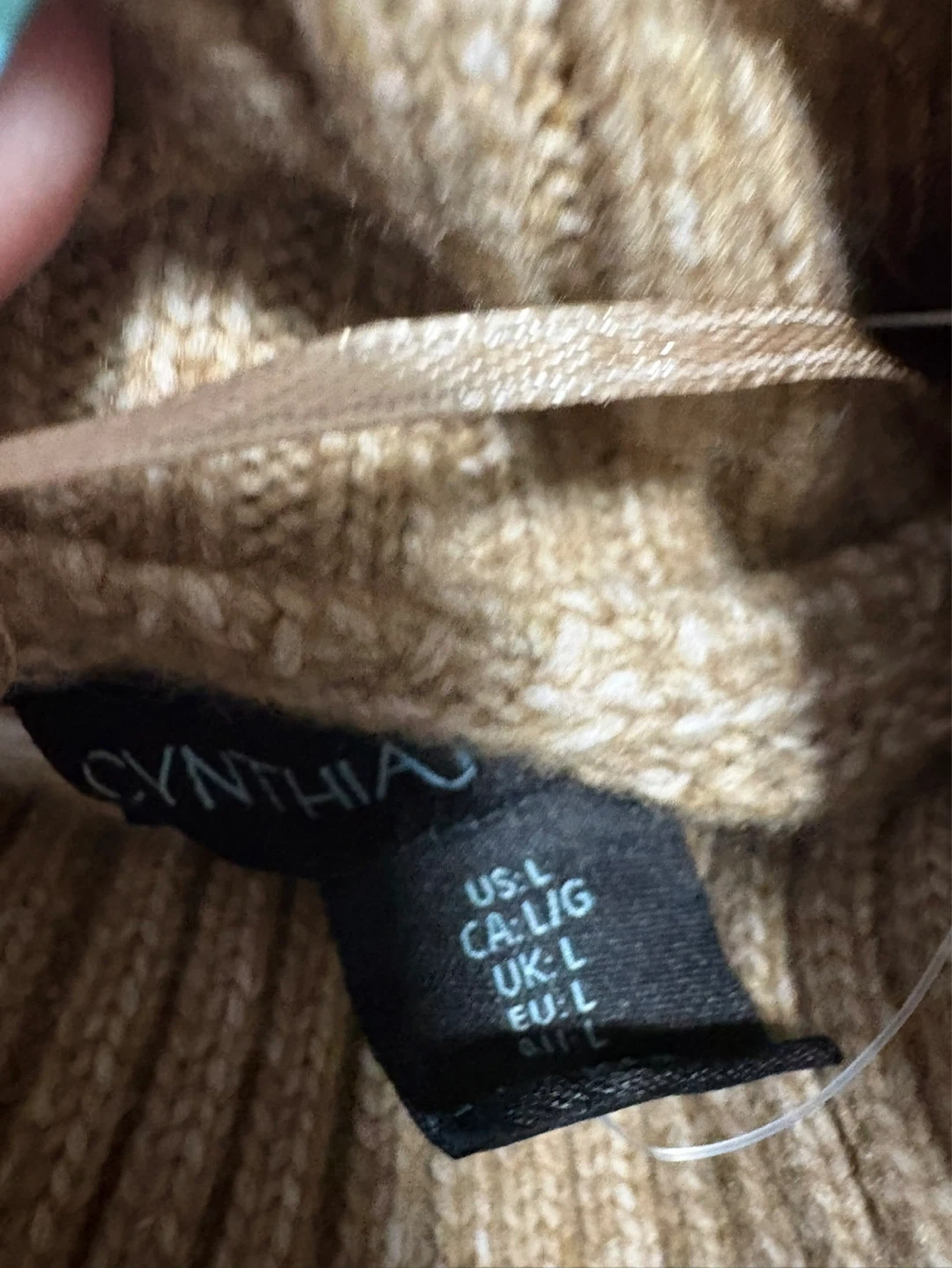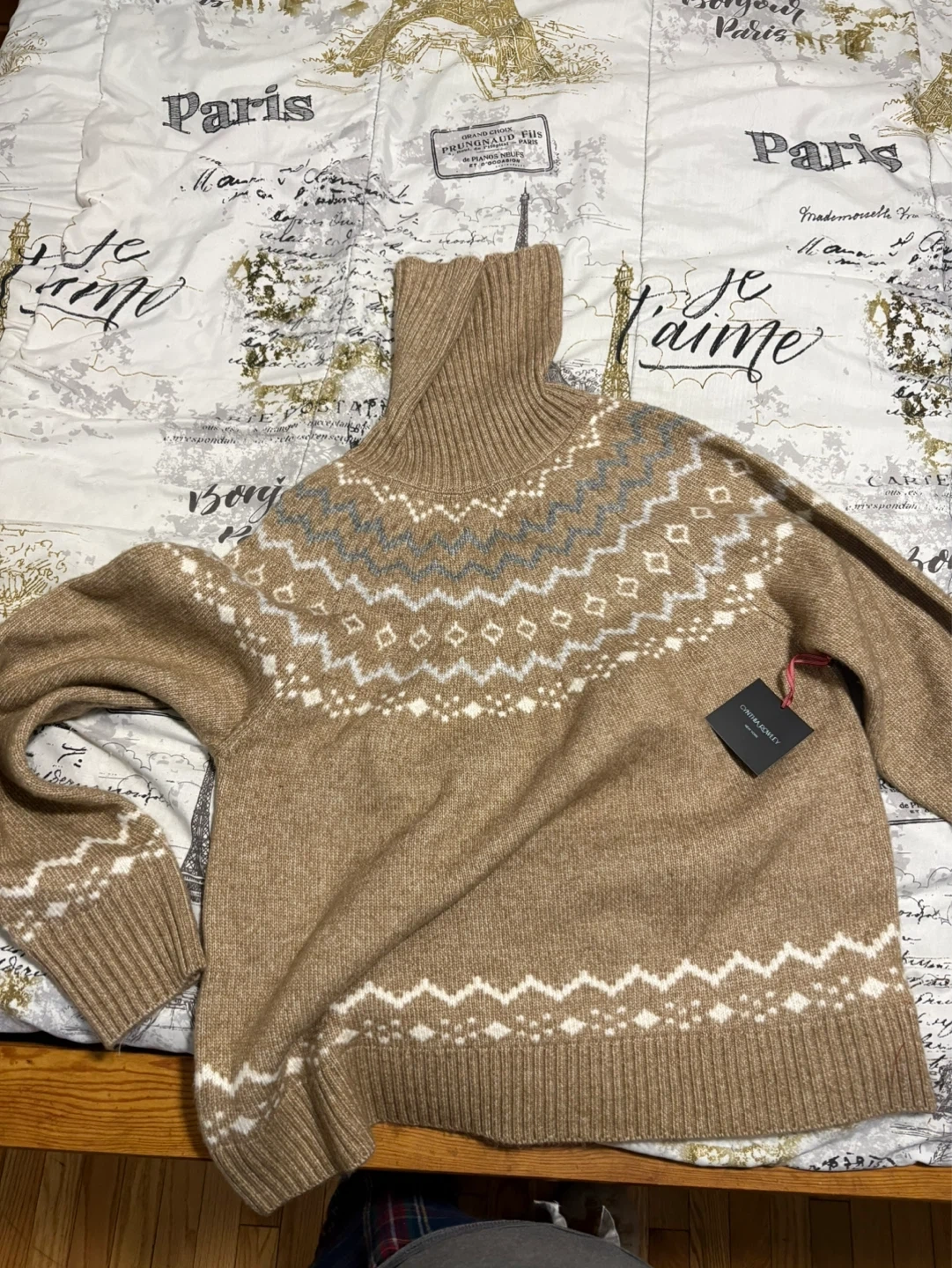 Cozy turtleneck sweater from Cynthia Rowley. Features a classic fair isle pattern in tan, white, and grey. Made with a soft knit material. Size L.