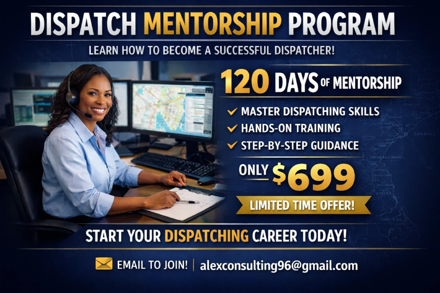 Learn how to become a successful dispatcher with 120 days of mentorship. This program offers master dispatching skills, hands-on training, and step-by-step guidance. Start your dispatching career today!
