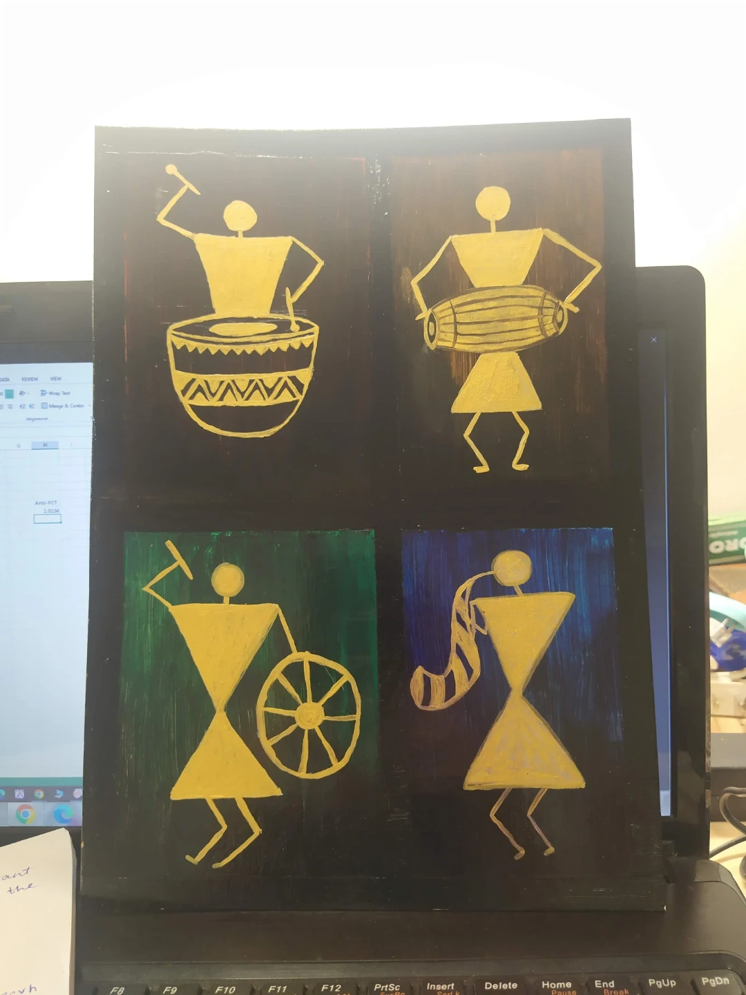 This is a folk art painting featuring four figures. Two figures are playing drums and another is playing a horn. The painting uses a traditional stick-figure style with vibrant colors.