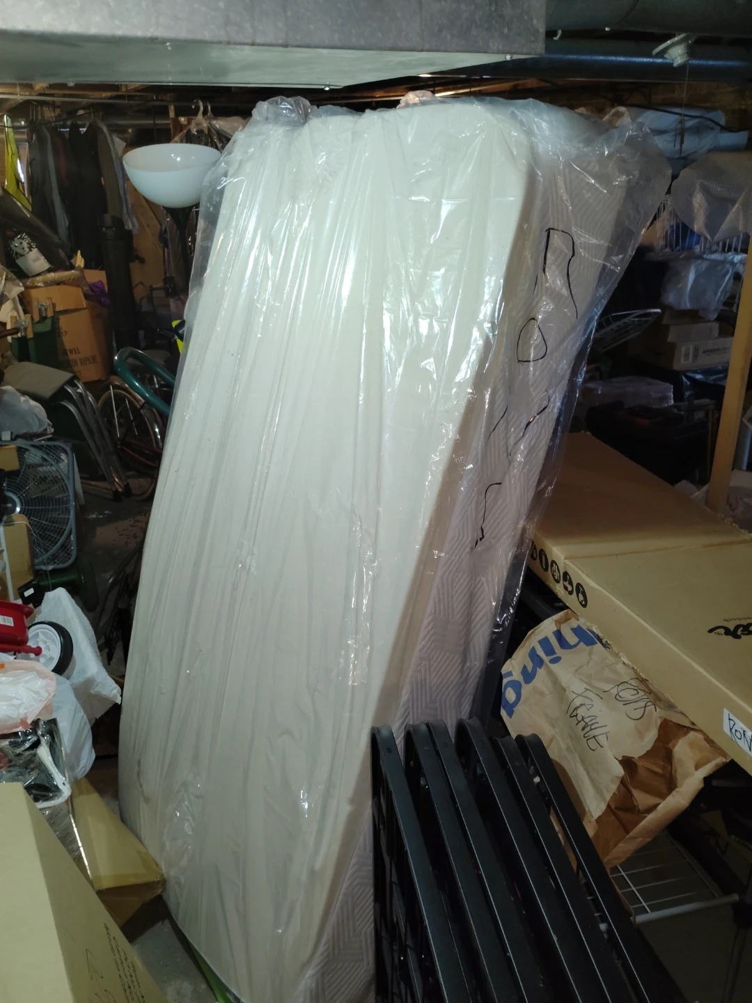 This is a folding bed frame and mattress set. The frame is made of black metal and folds for easy storage. The mattress is white and appears to be a standard twin size. It's great for guest rooms or temporary sleeping arrangements!