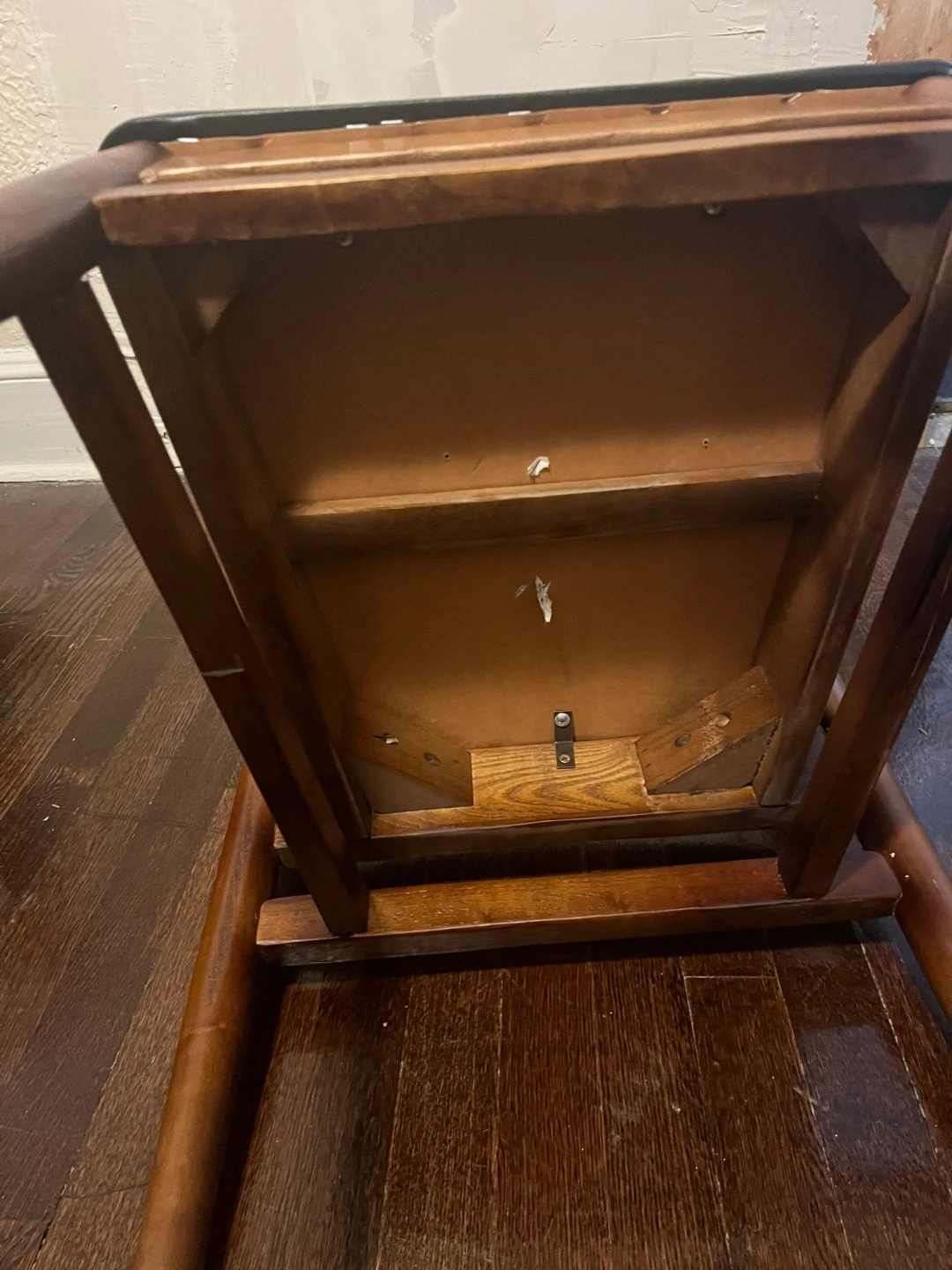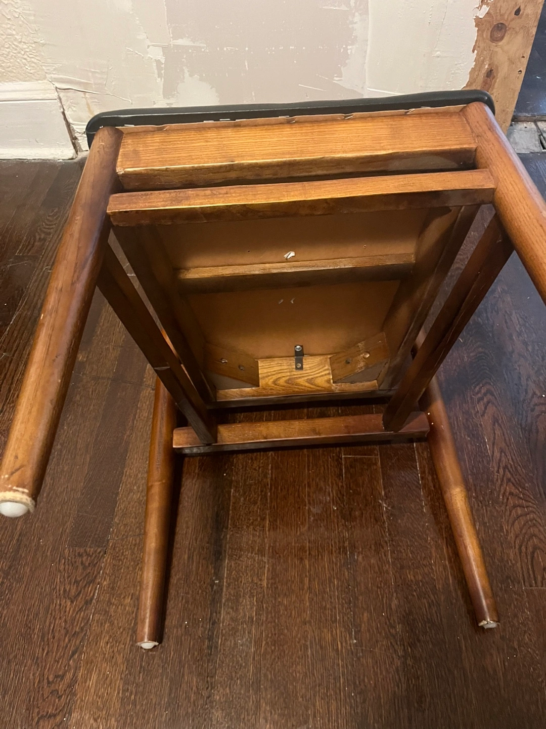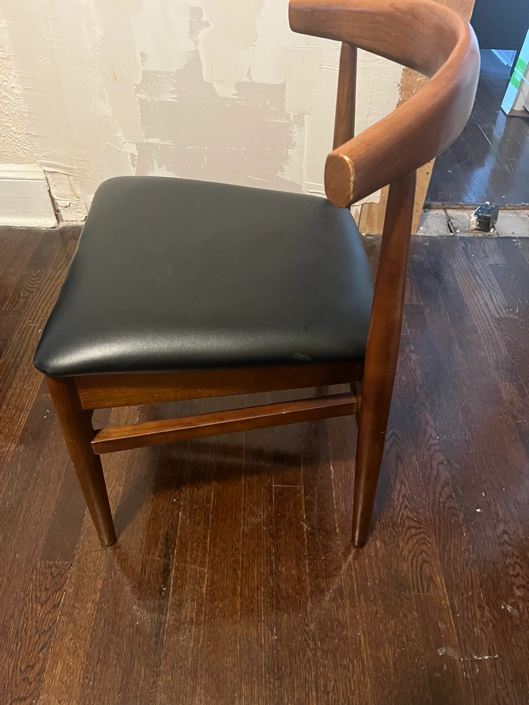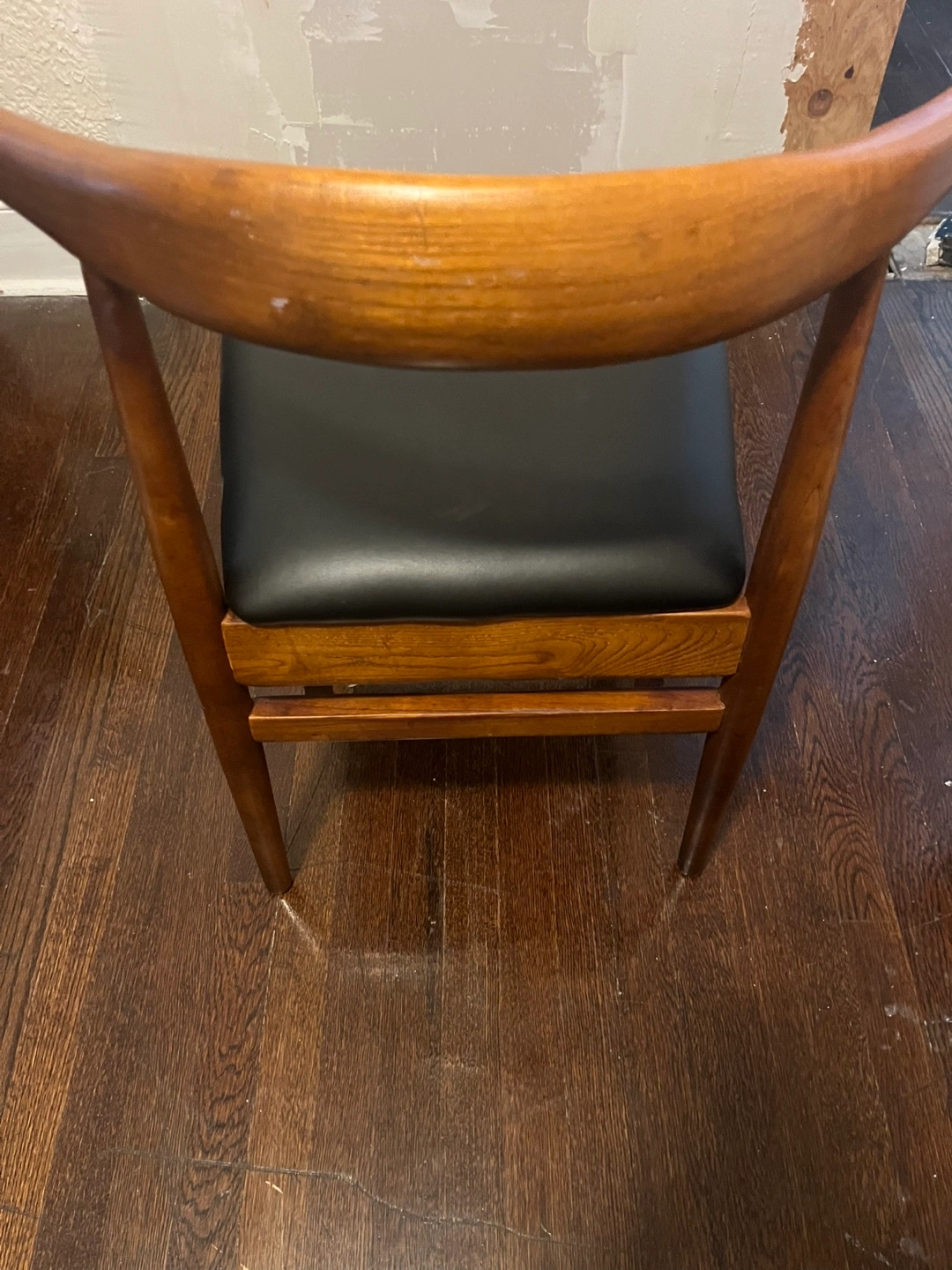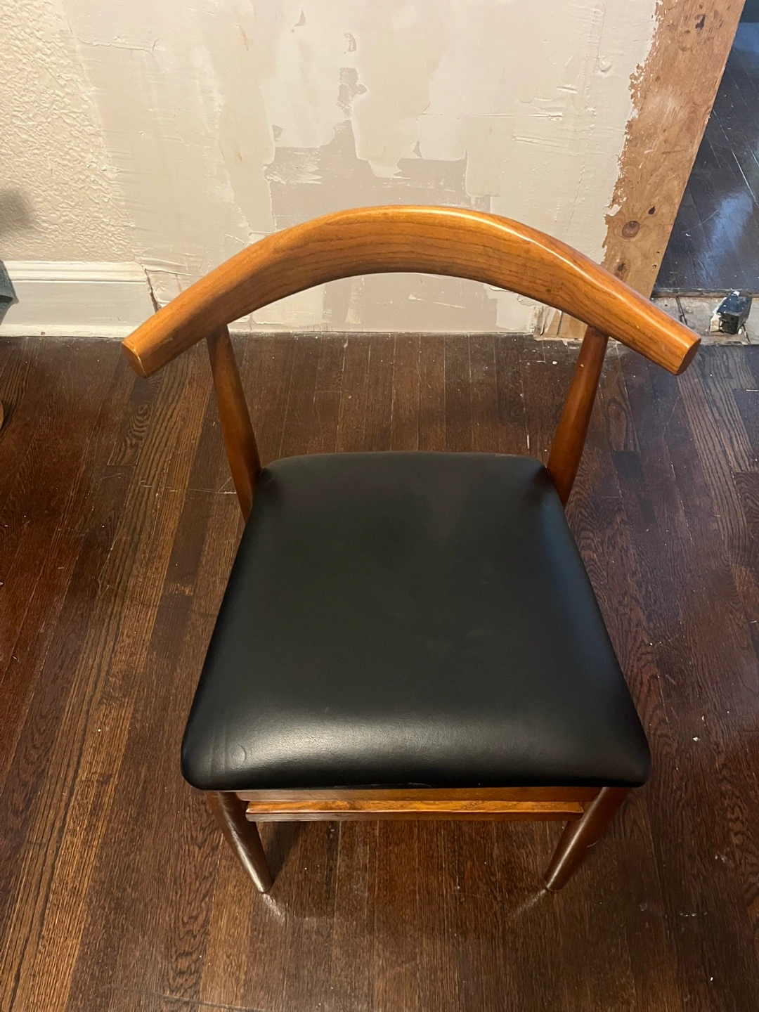 Add a touch of timeless mid-century style to your dining area with this beautiful wooden dining chair. Featuring a gently curved backrest, tapered wooden legs, and a sleek black vinyl seat, this piece captures the look of iconic Danish designs from the 1960s.