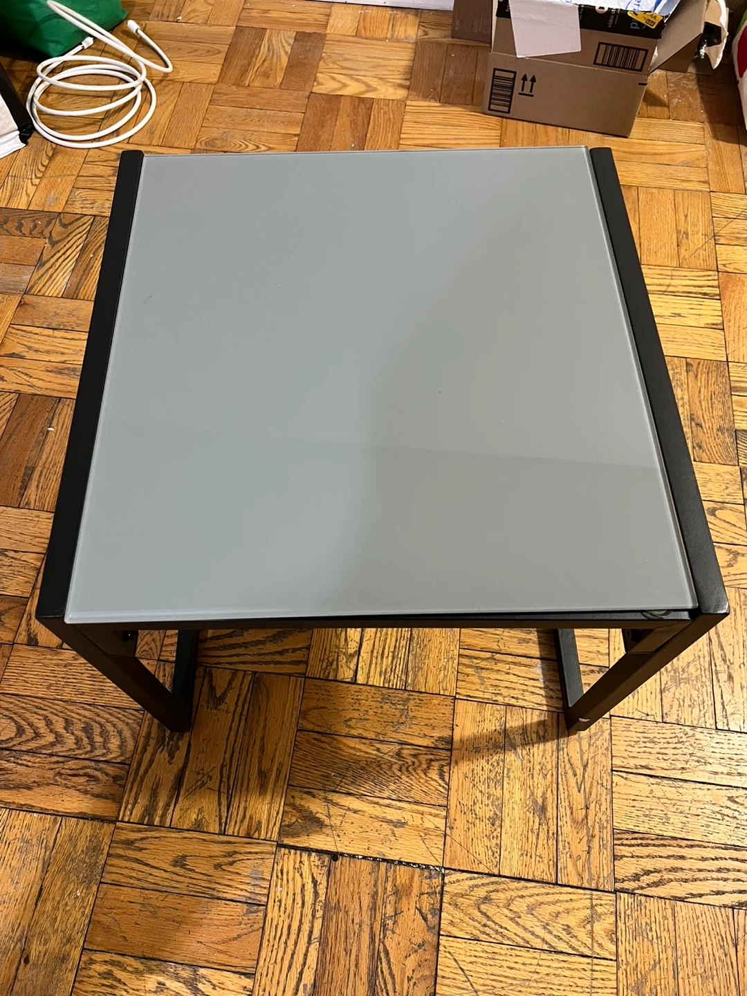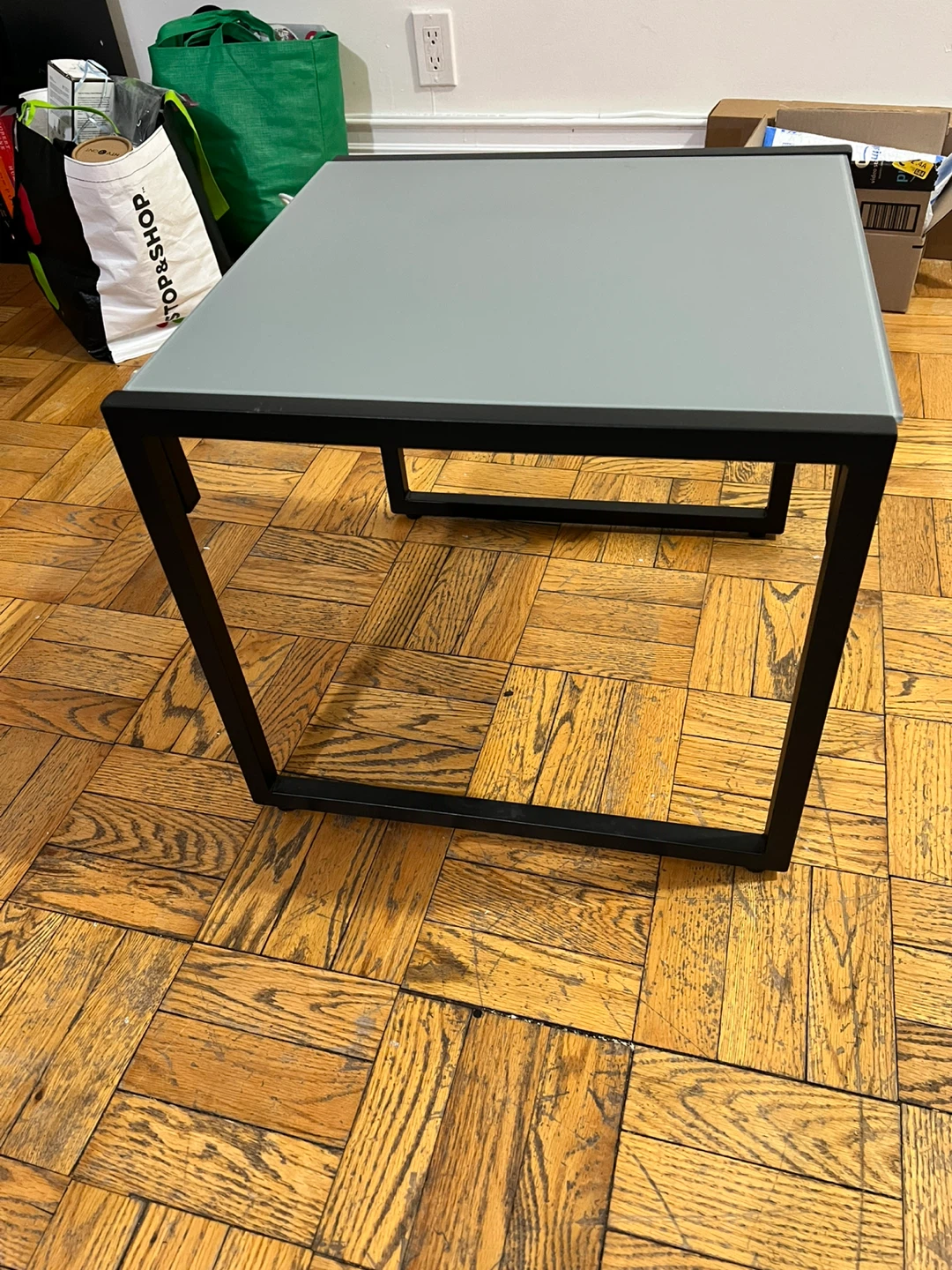 This is a modern end table with a black metal frame and a frosted glass top. It's a compact size, perfect for use next to a sofa or chair. The clean design fits most living spaces.