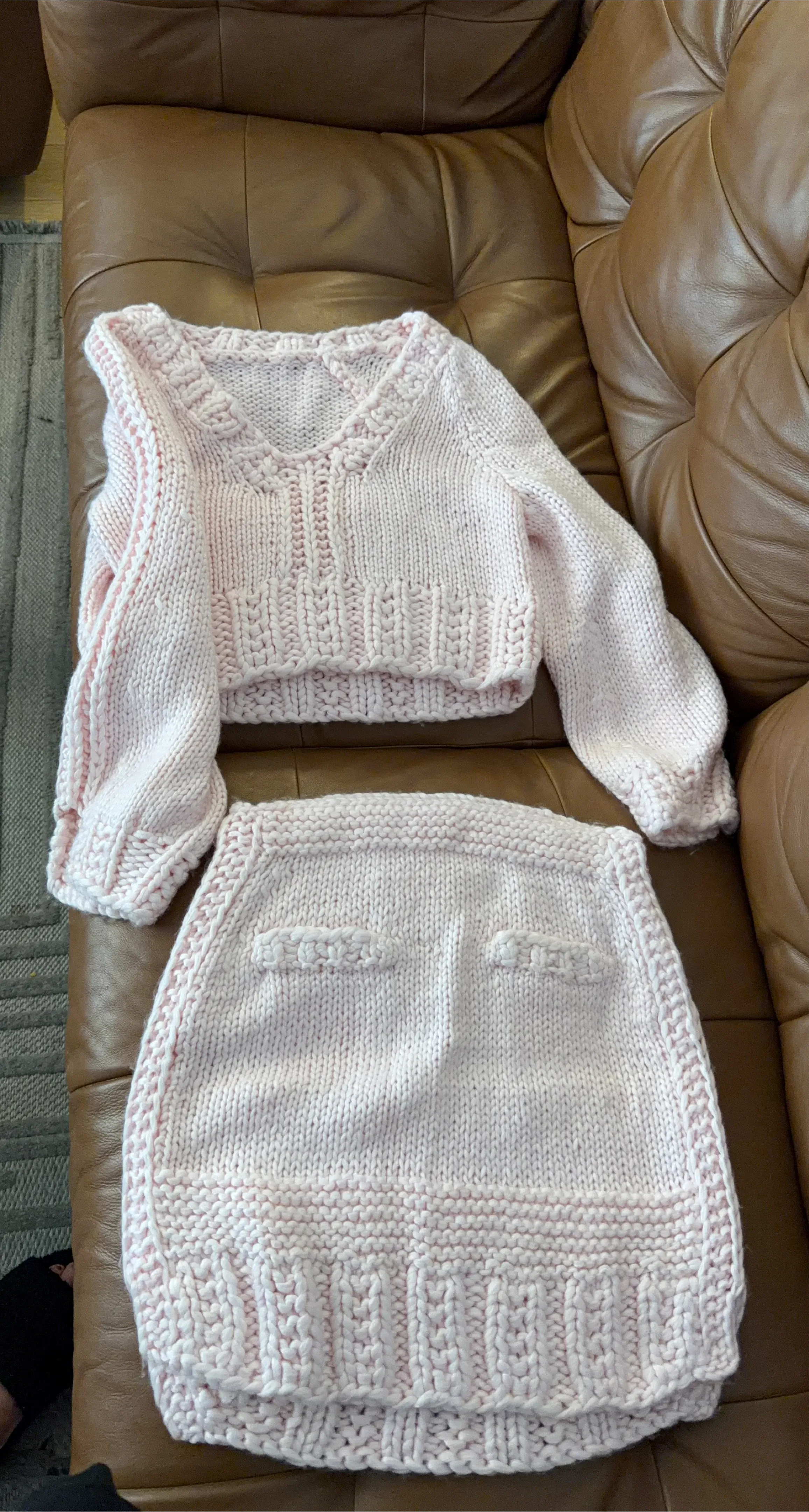 A sweet, handmade pink knit sweater and skirt set. It's a cropped sweater with a v-neck. The skirt is a mini length with faux pockets. Both pieces feature intricate cable knit detailing.