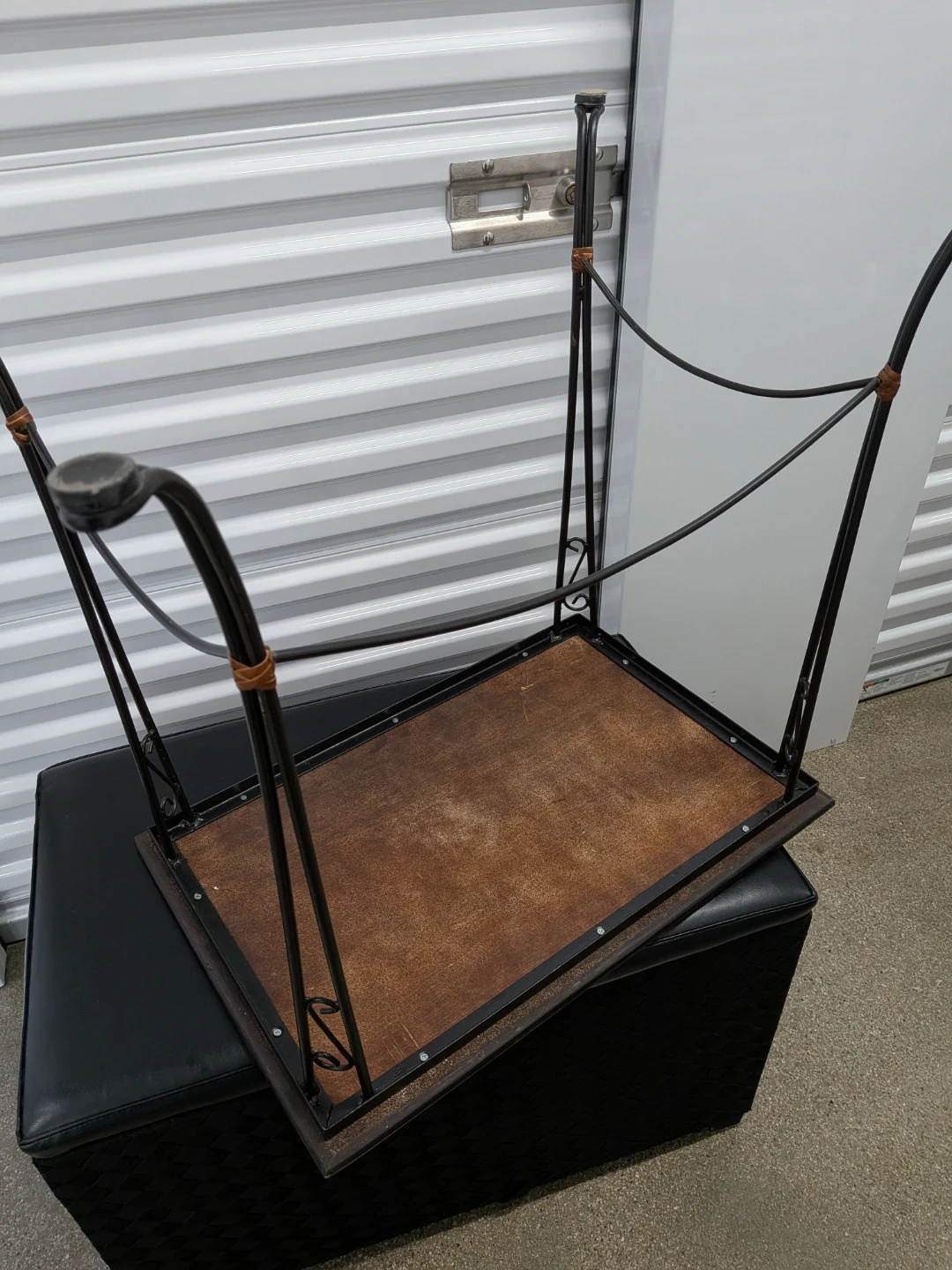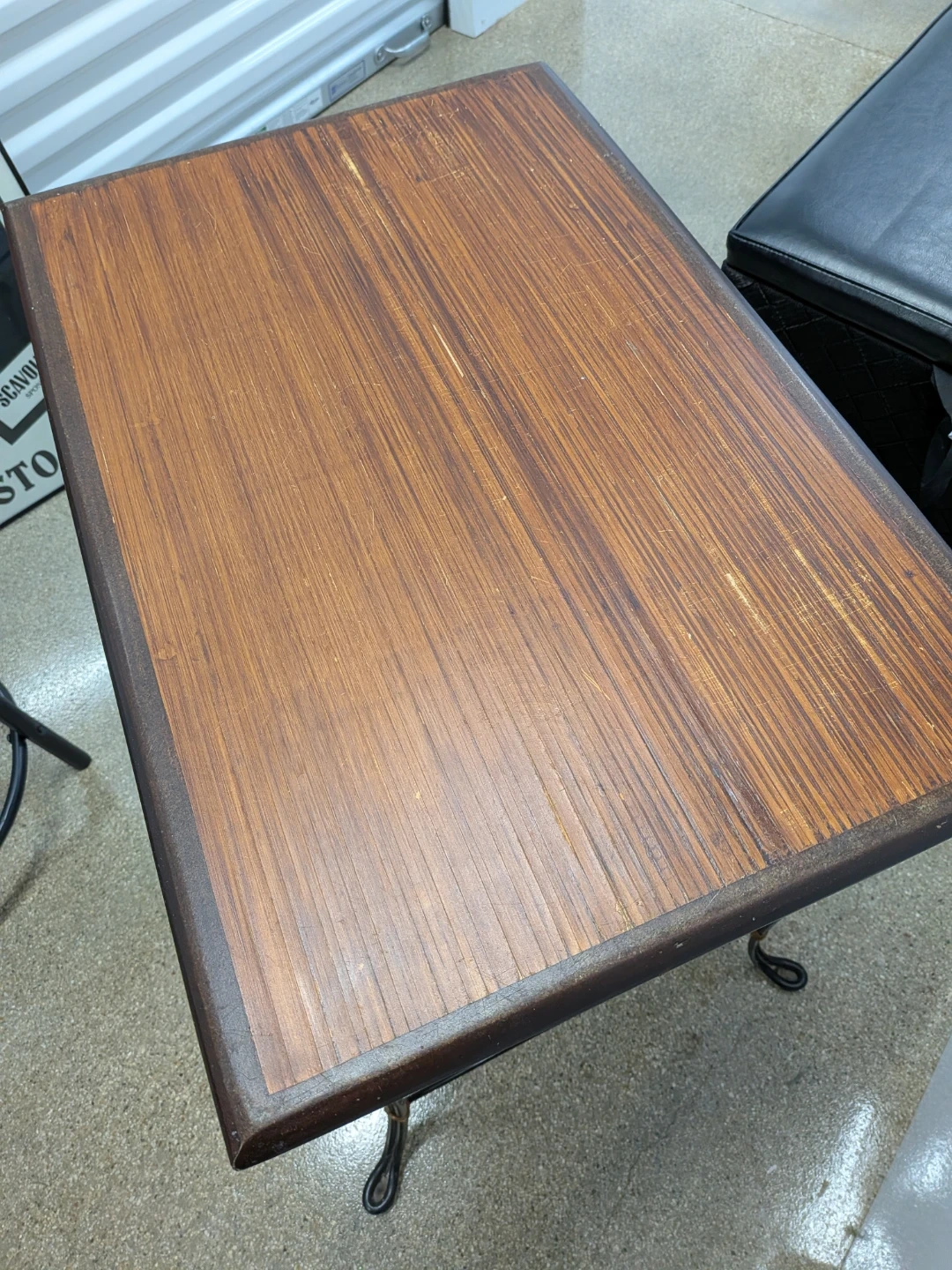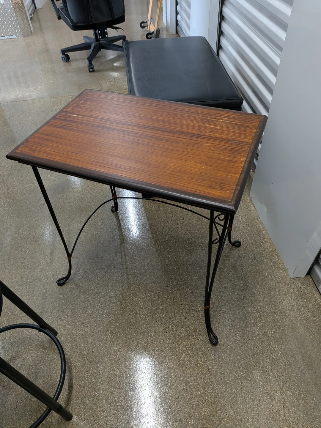Selling a cute accent table with a brown wood top and black metal legs. It's in good condition.