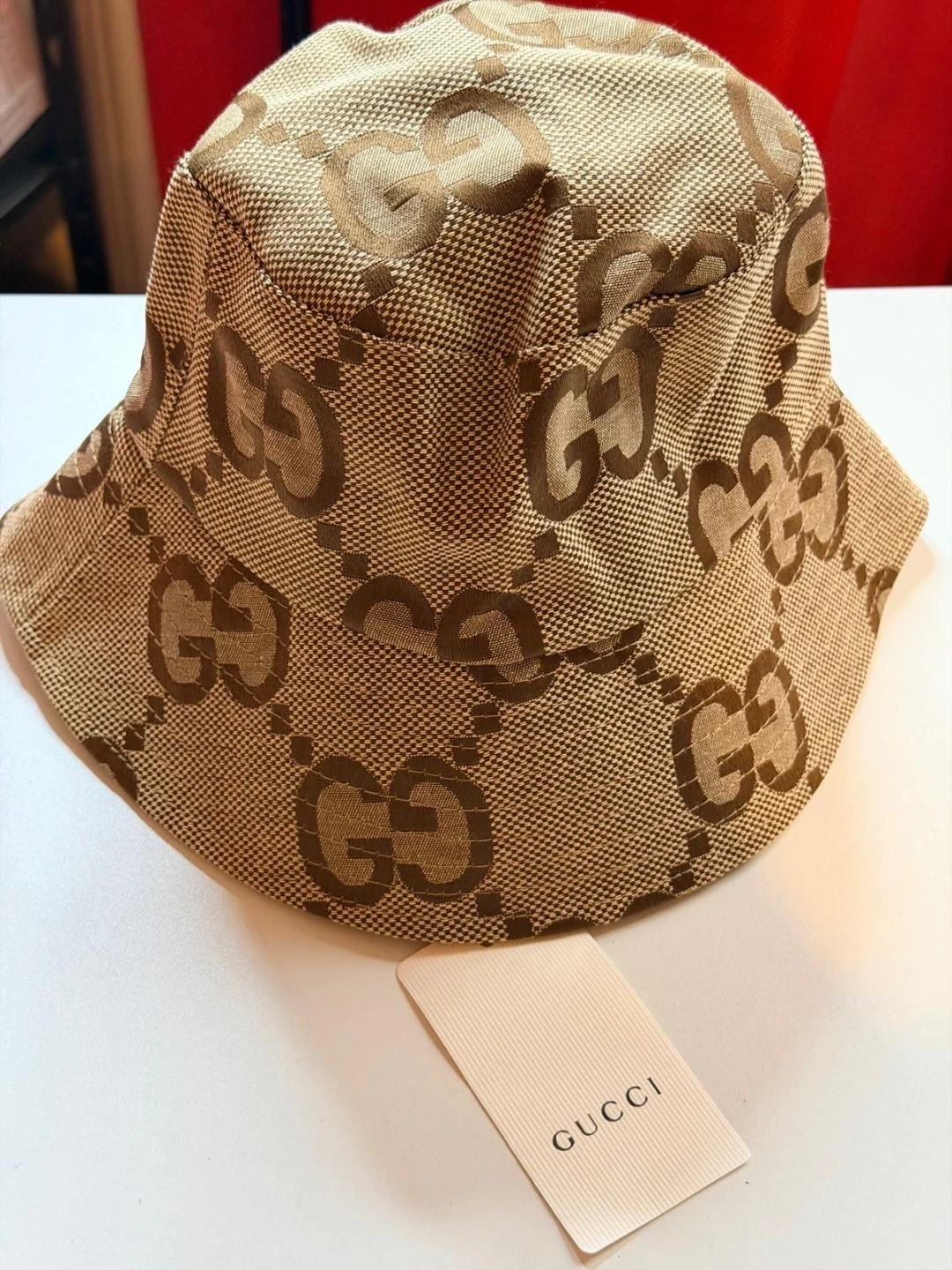 Classic Gucci bucket hat featuring the iconic GG canvas pattern. Made with a durable canvas material. A stylish accessory for any outfit. Adds a touch of luxury to your look!