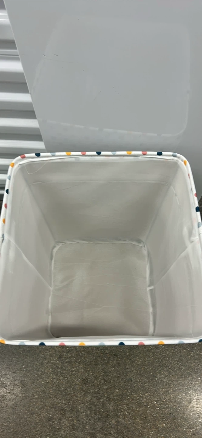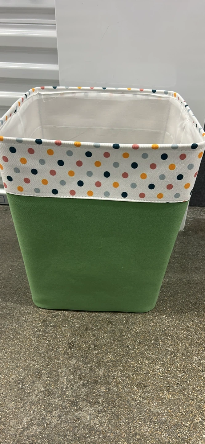 This fabric storage laundry is a great way to organize your space. It features a cheerful polka dot trim around the opening and a solid green exterior. Interior lining for durability. Perfect for kids' rooms or any area needing a touch of fun organization!