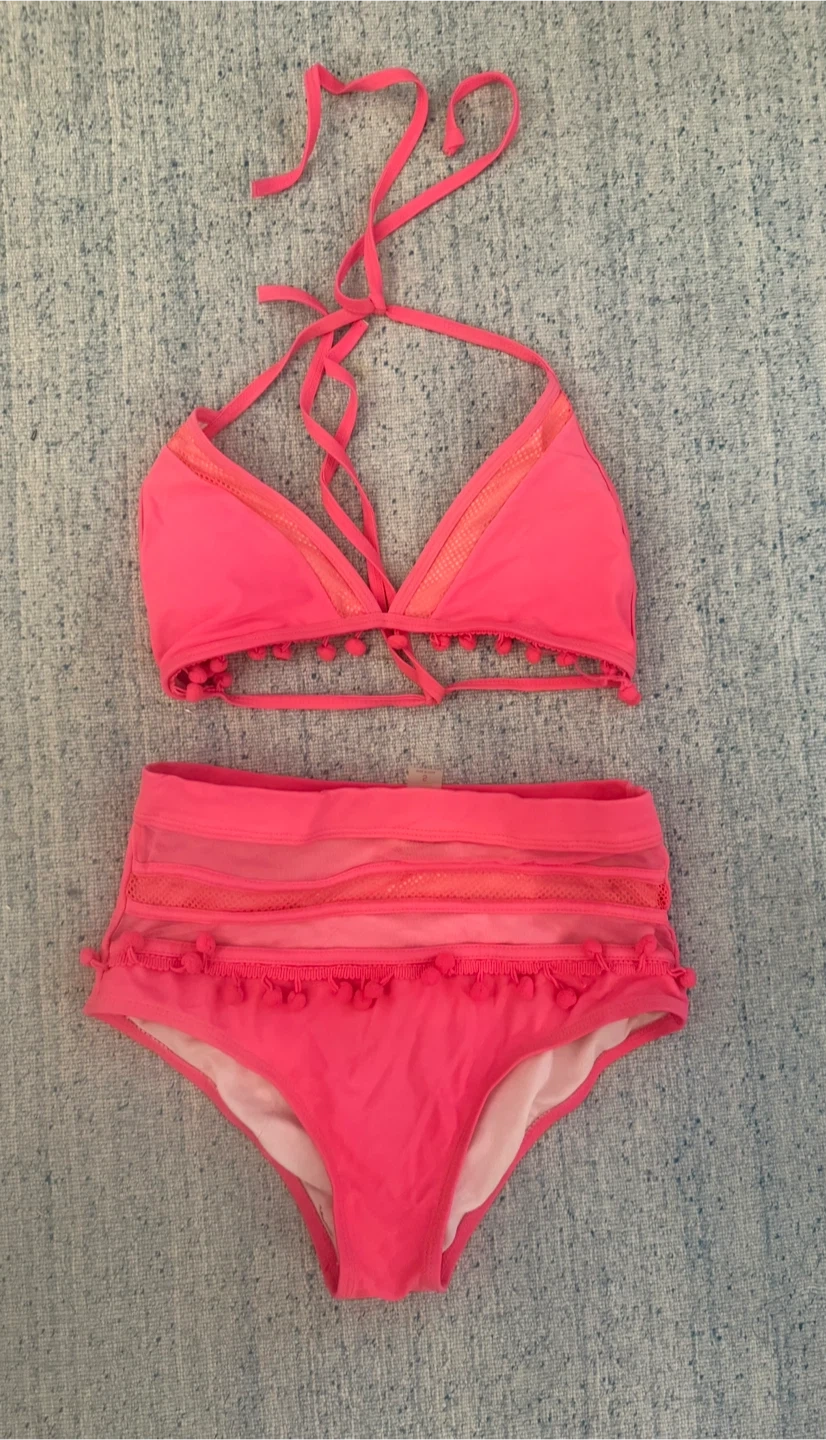 This pink bikini features a halter top with crisscross straps and decorative pom poms along the hem. The high-waisted bottoms have sheer mesh panels and matching pom pom trim. It's a fun and flirty swimsuit!
