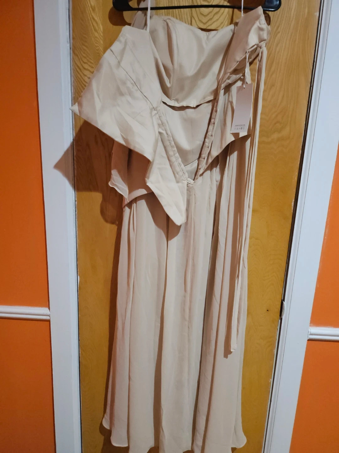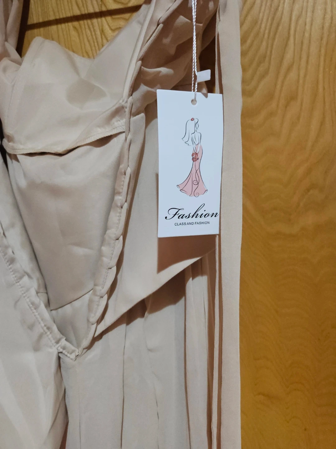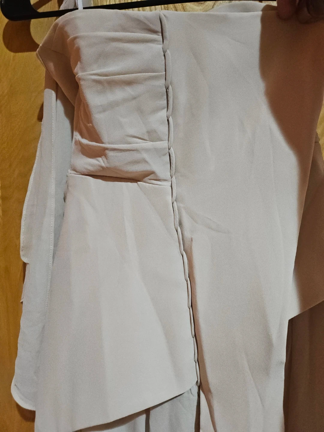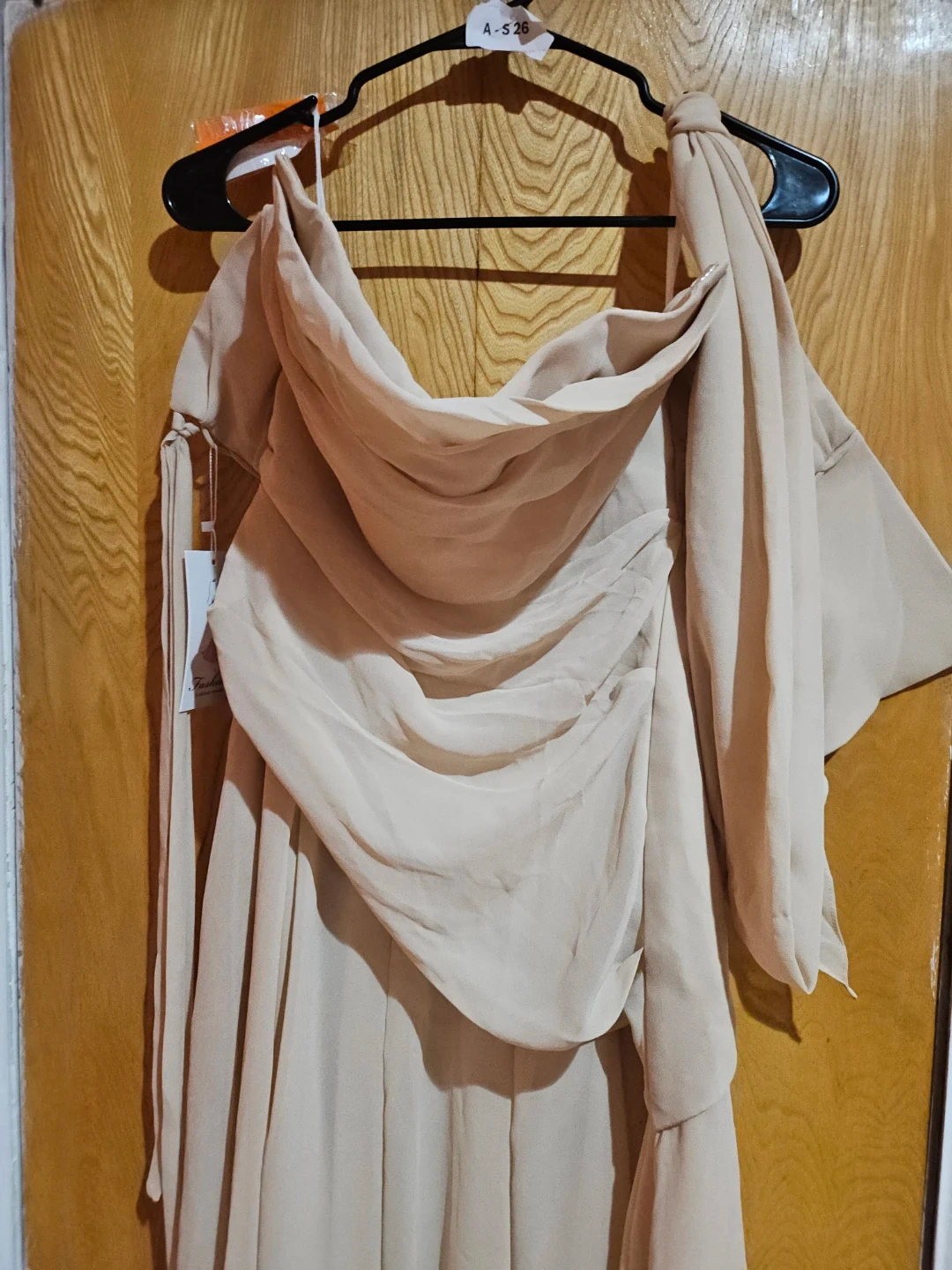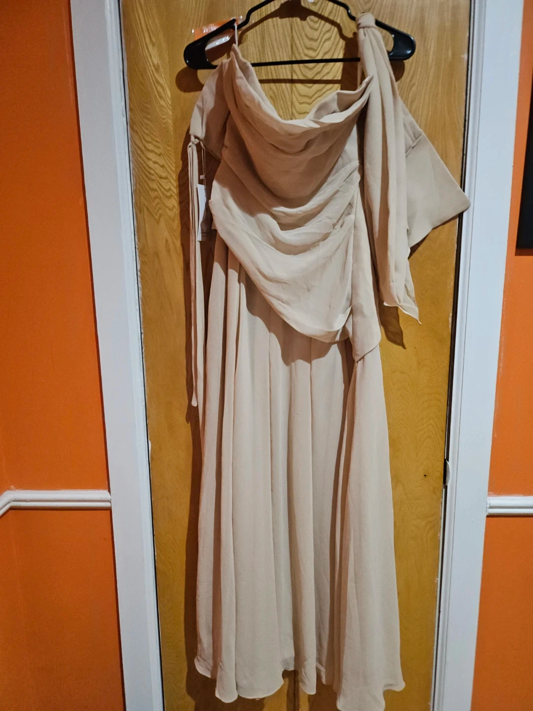 Beautifully draped chiffon dress in a neutral tone. Features an off-the-shoulder neckline with ruched detailing. This flowy gown is perfect for formal events.