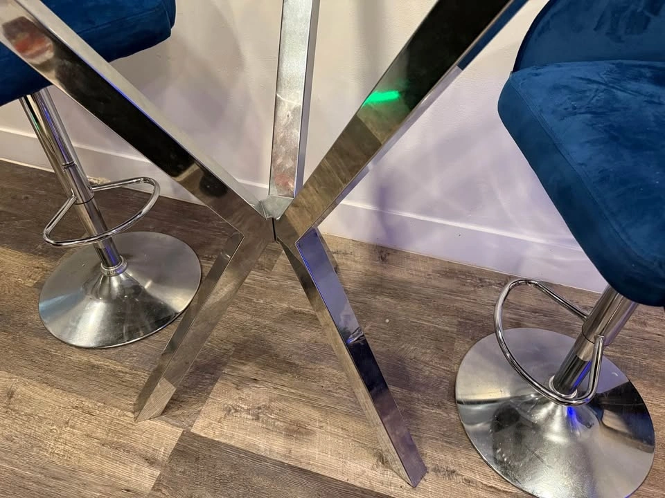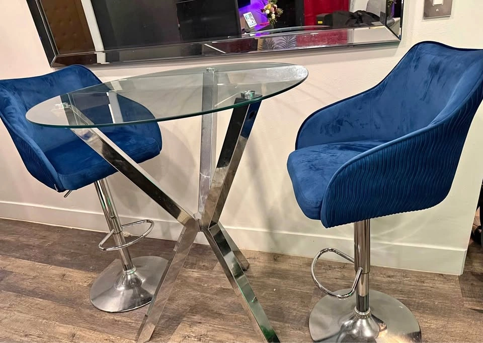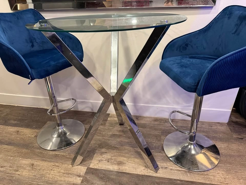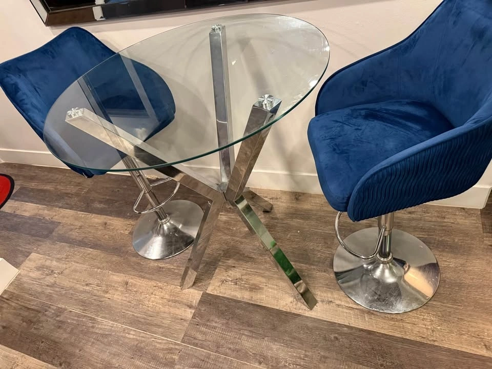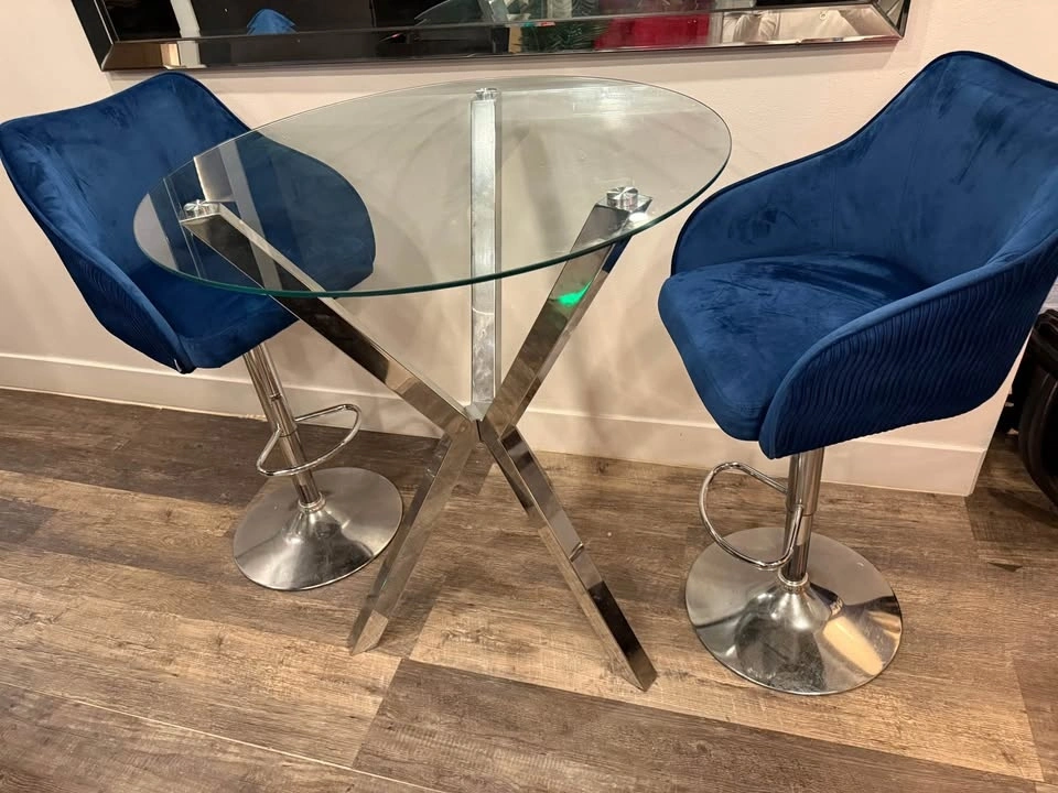 Selling this high dining table set with two beautiful navy blue barstool chairs. It’s in good condition with minor scratches not visible to the naked eye. Selling as is!