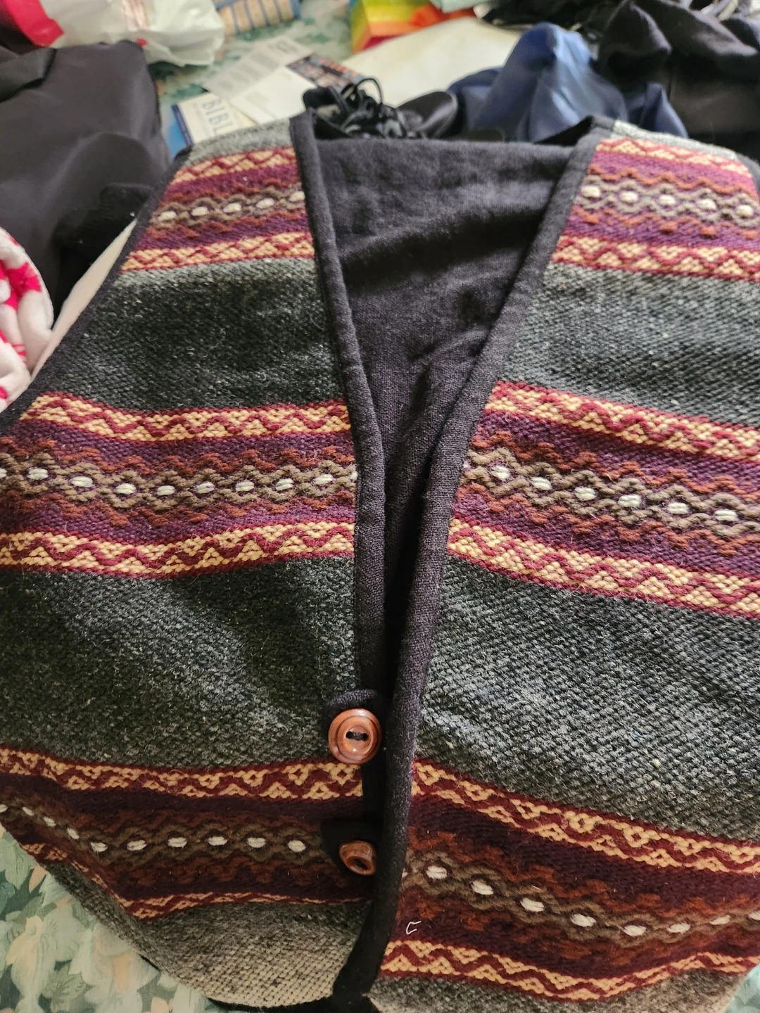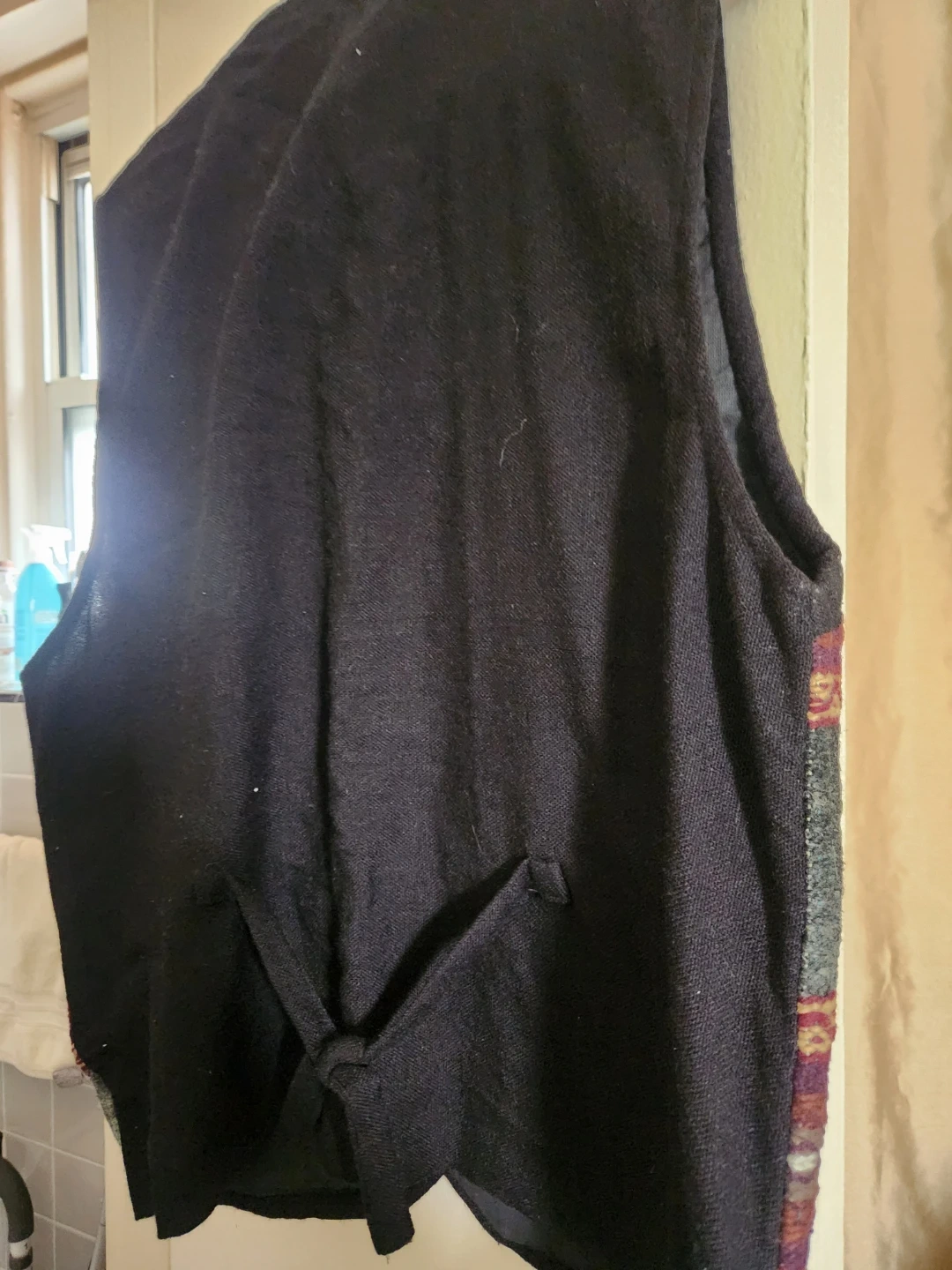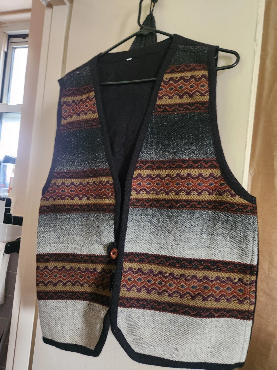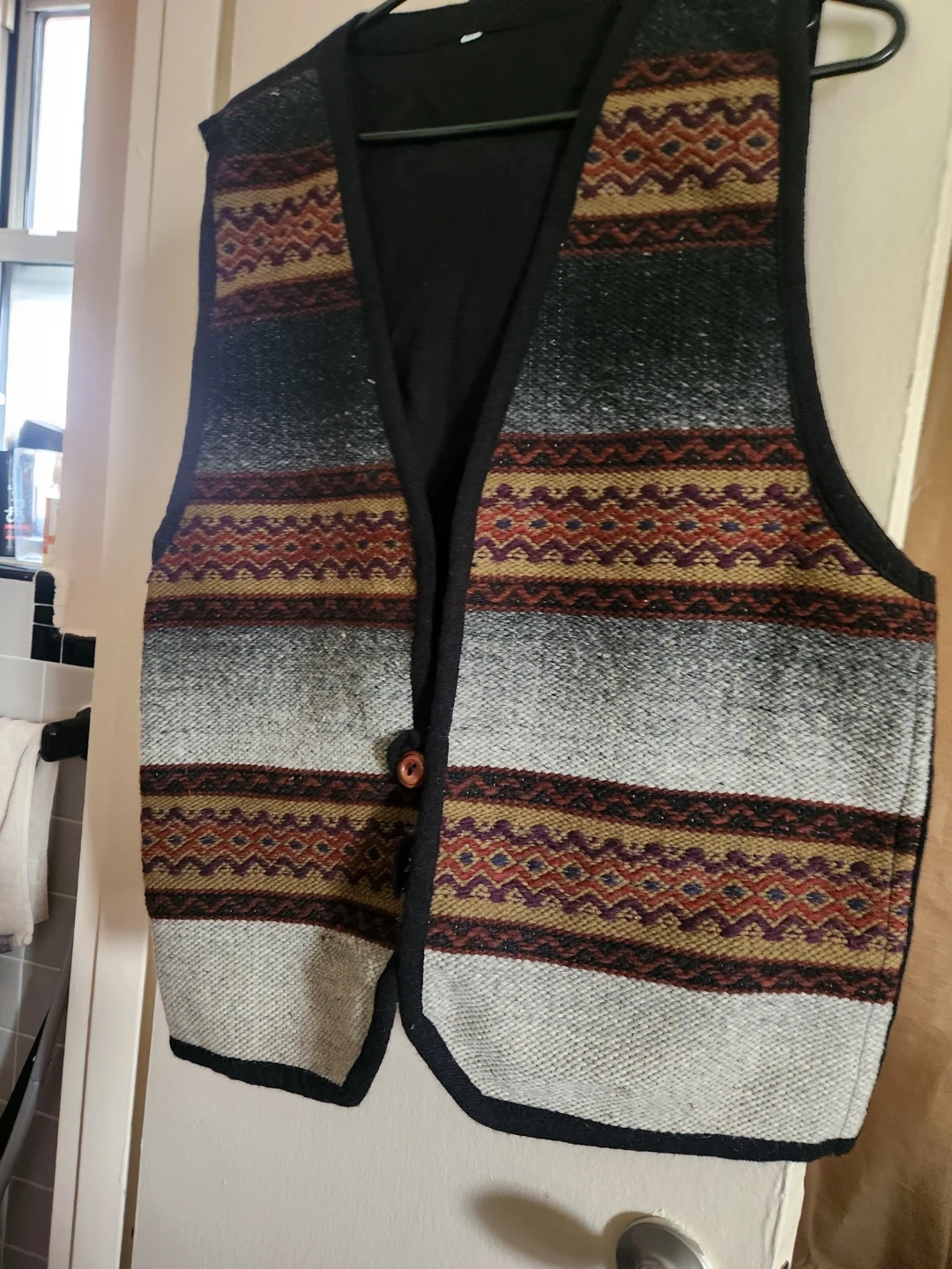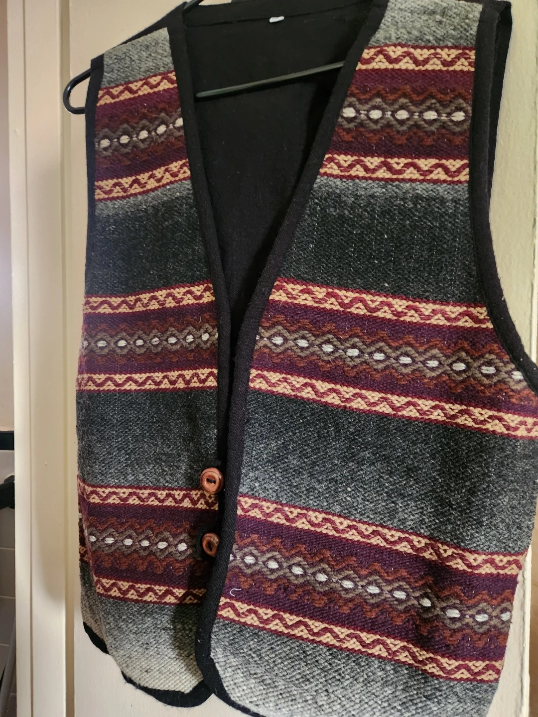 TWO Men's knit vest with a black backing and colorful striped pattern on the front. It features a button-up closure and two front pockets. Material appears to be a wool blend.