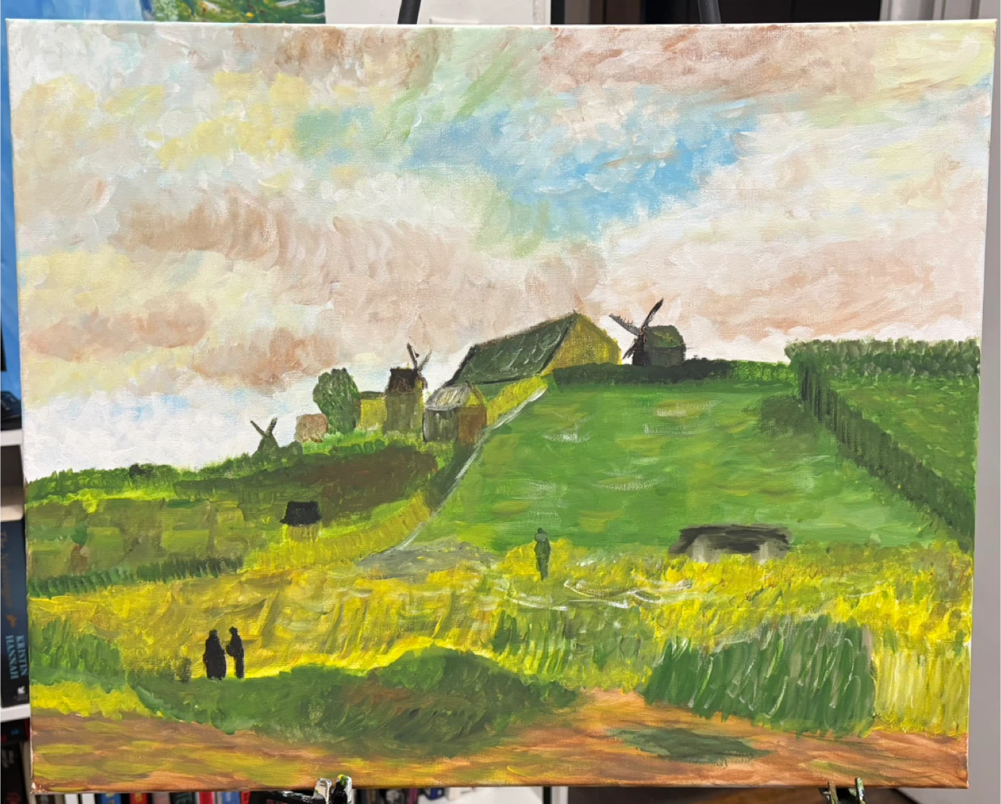 This is a replica acrylic hand painting depicting a landscape with windmills, rolling green hills, and a field of yellow flowers. It's rendered in a vibrant, textured style. The artwork features a rustic scene with a few figures in the distance.