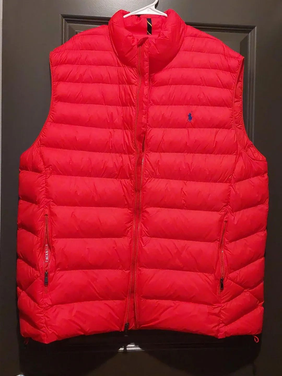 Red/Orange packable down vest by Polo Ralph Lauren. It has a zip front closure and two zip pockets. Material: 100% Nylon shell and lining. Fill: 90% Down, 10% Feathers. Never Worn.