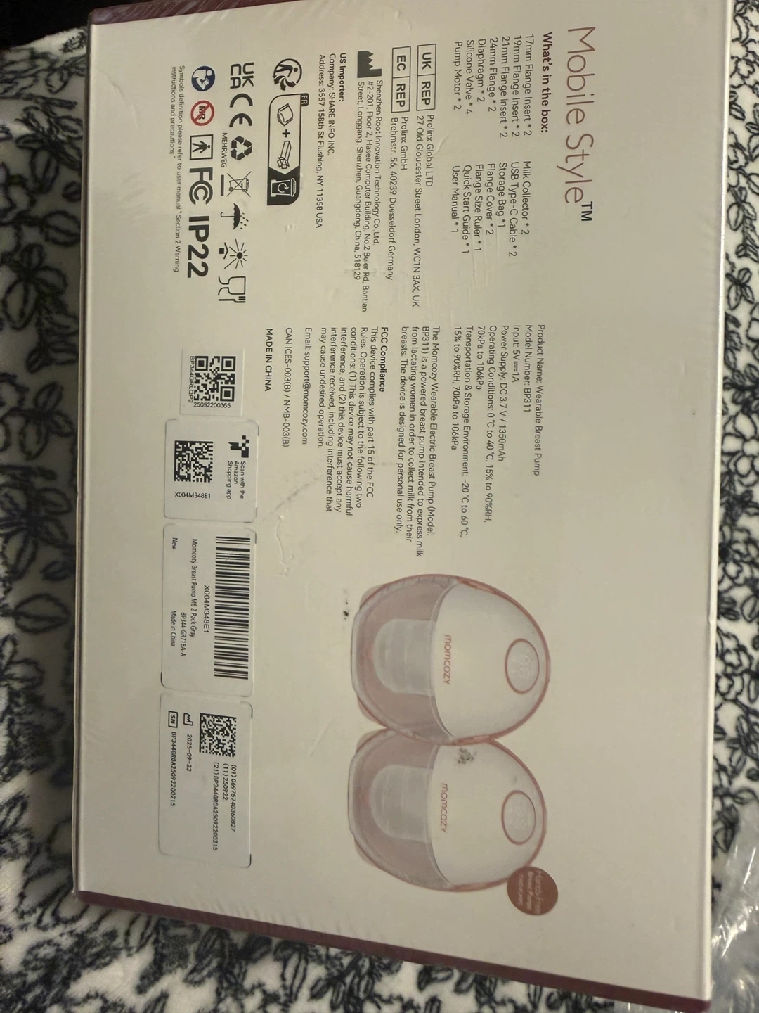Momcozy Mobile Style breast pumps in a 2-pack set. It's hands-free and compact, designed to fit perfectly in a bra. Includes mini collectors, flange inserts, USB type-C cable, storage bag, and silicone valves. This electric breast pump model is ideal for on-the-go use.