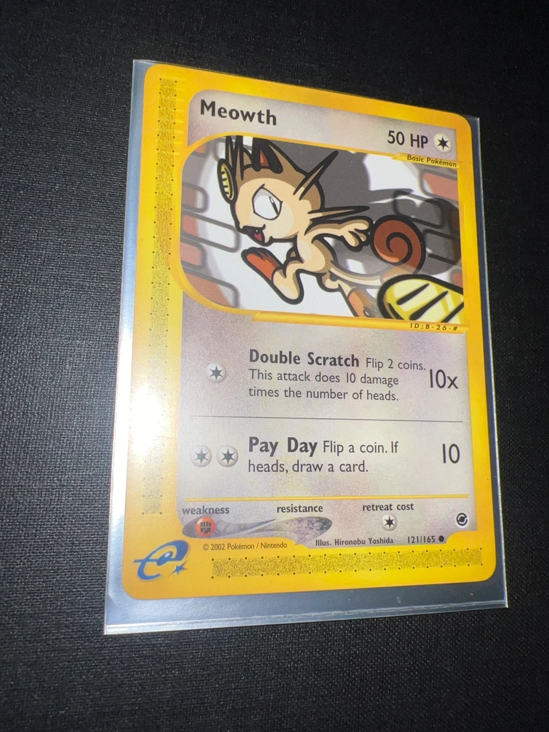 This is a Meowth Pokemon card from 2002. It's the 121/165 series. The card has 'Double Scratch' and 'Pay Day' attacks. It's a basic Pokemon with 50 HP.