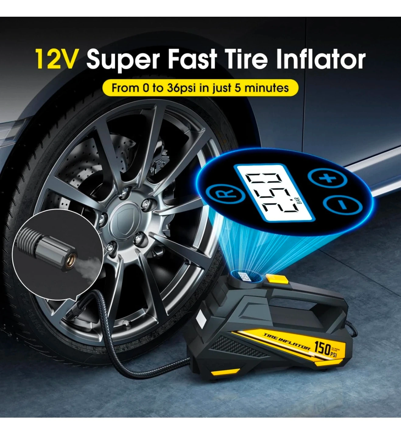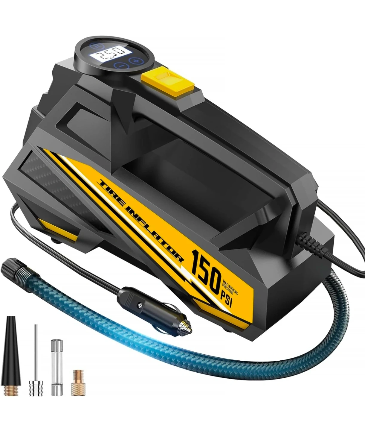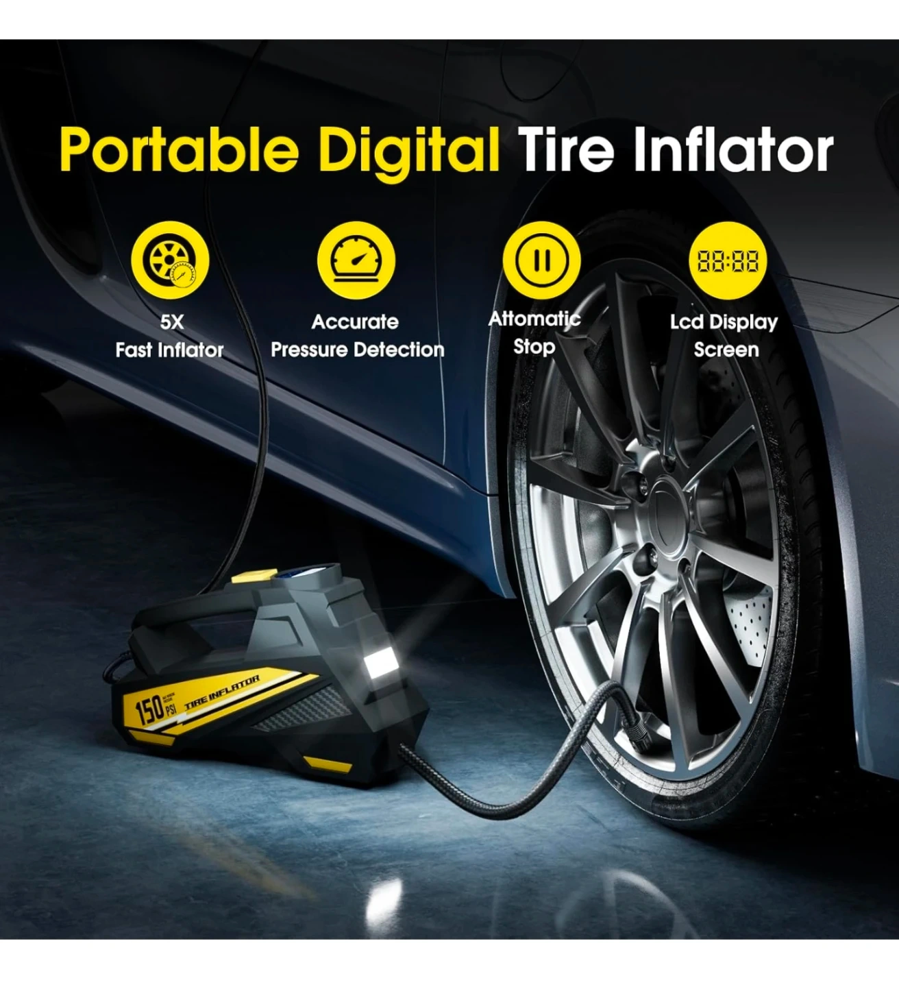Tire Inflator Portable Air Compressor- 12V DC Air Pump for Car Tires with 150PSI LCD Digital Gauge & Emergency LED Light,Auto Tire Pump for Cars,Motorcycles,Bikes,Balls