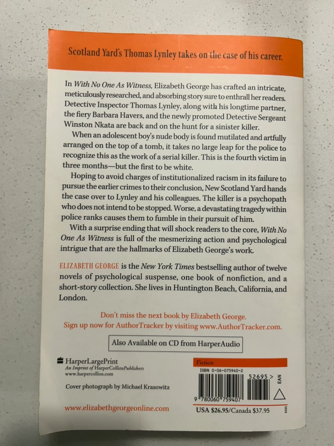 Selling the book 'With No One As Witness' by Elizabeth George. It's a large print edition. The story follows Scotland Yard's Thomas Lynley as he takes on a new case. A suspenseful read!