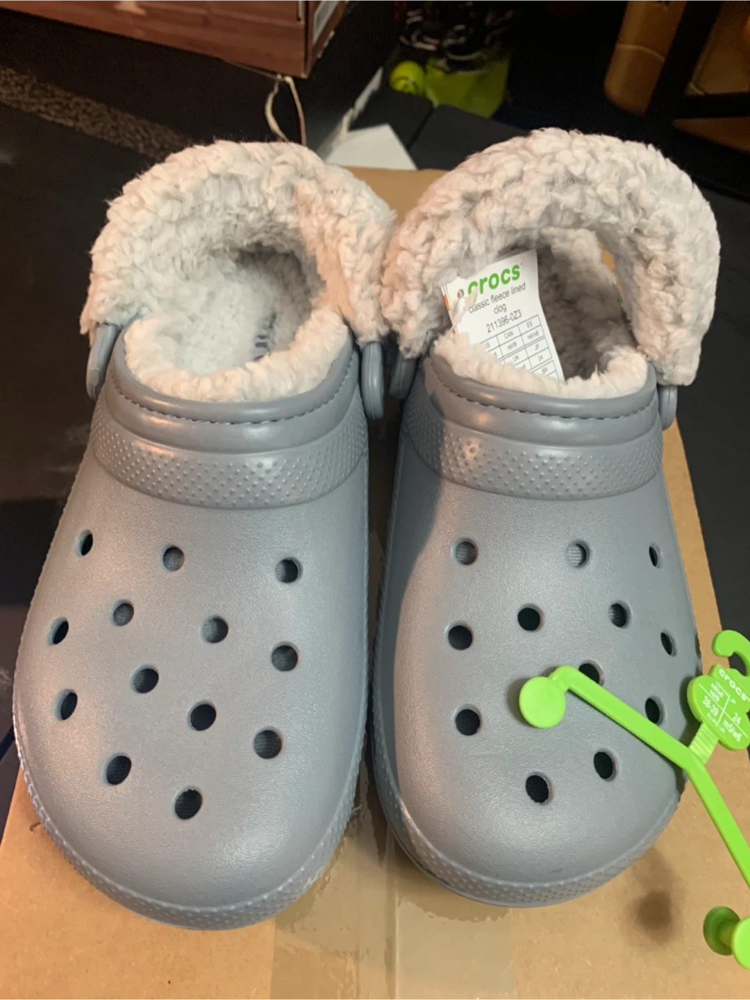Selling a pair of Crocs Classic Fleece Lined Clogs in a light gray color! They are in Brand New condition and super cozy with the fleece lining. The size is US M6/W8, EUR 38-39, and 250mm. Perfect for keeping your feet warm and comfortable!