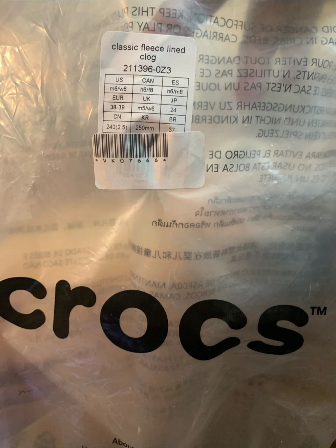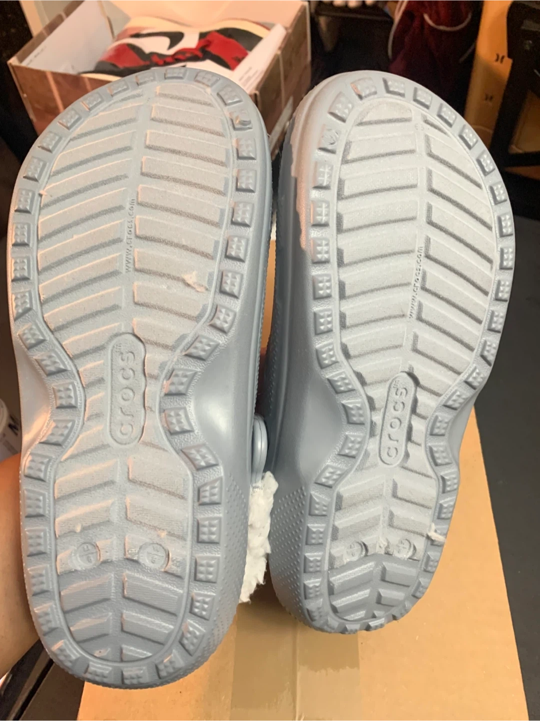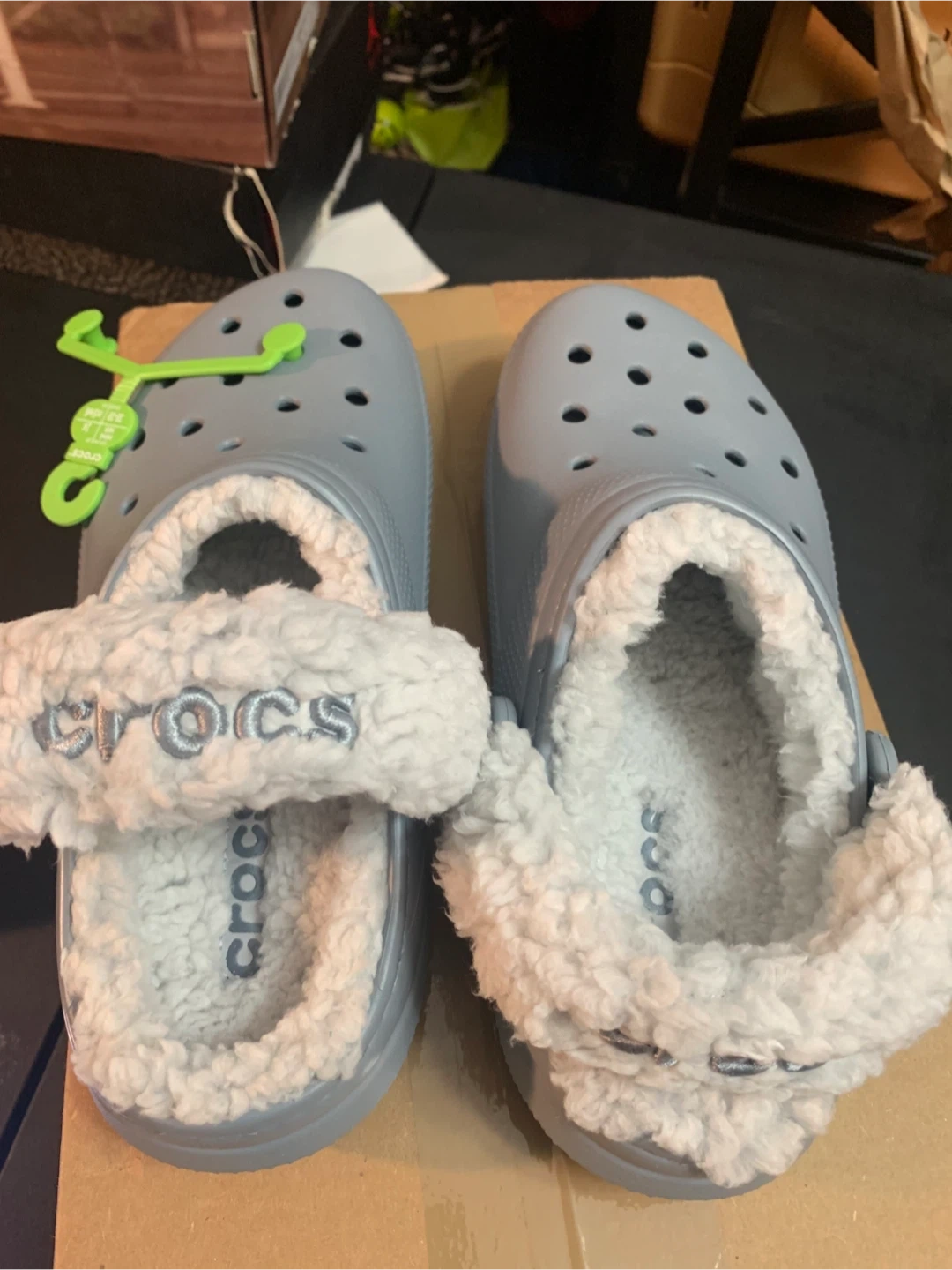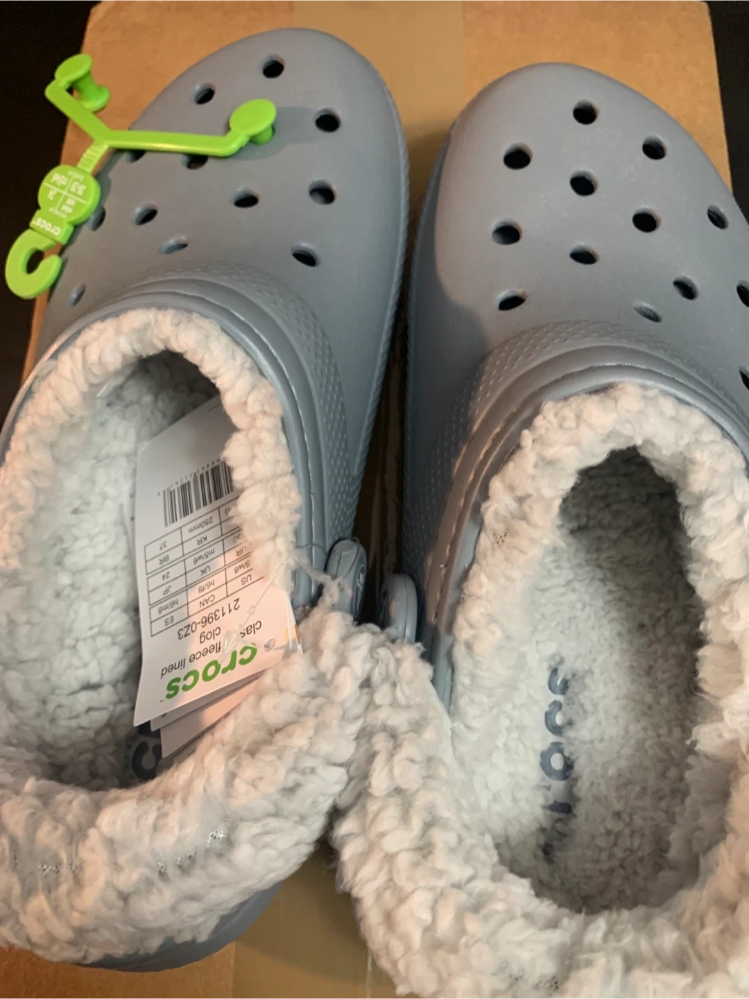 Selling a pair of Crocs Classic Fleece Lined Clogs in a light gray color! They are in Brand New condition and super cozy with the fleece lining. The size is US M6/W8, EUR 38-39, and 250mm. Perfect for keeping your feet warm and comfortable!