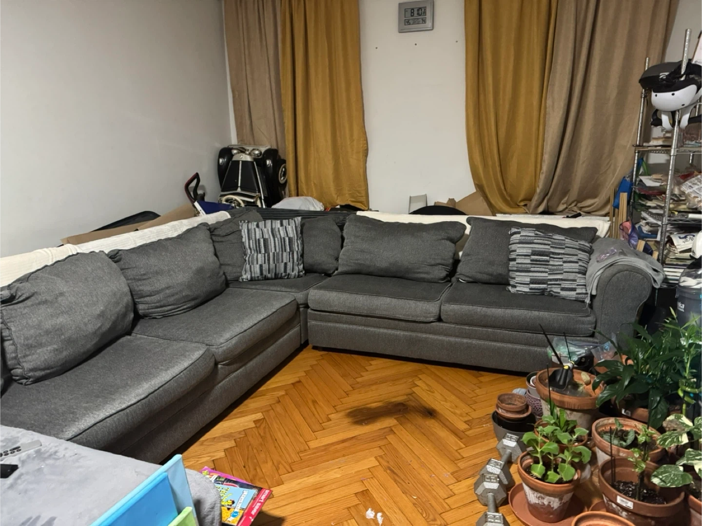 Gray fabric sectional sofa with multiple cushions and bed built inside It's a comfortable seating option for any living space. Sofa includes accent pillows. Just a small damage to the inside where the spring is supposed to hold the level of the chair. Bit it doesn’t look as bad as I am explaining