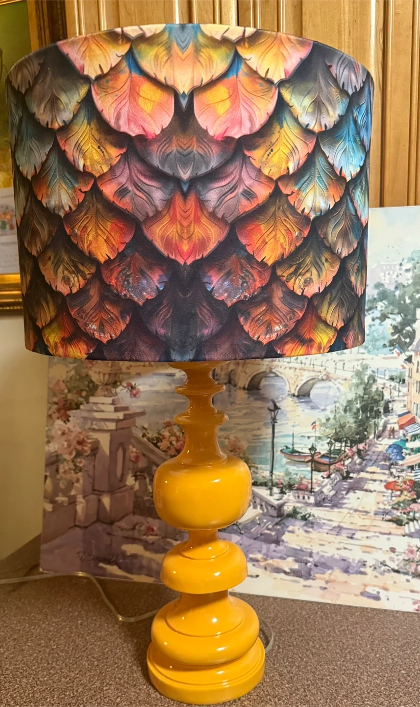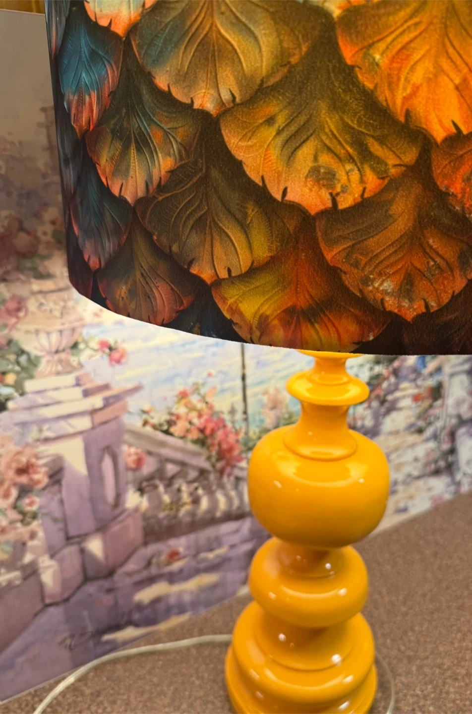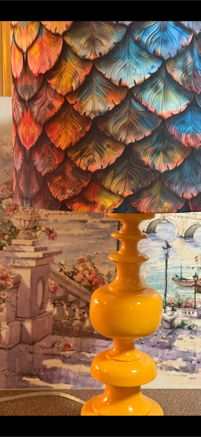 Here's a stylish colorful table lamp that will add a pop of color to any room! The shade features a unique and eye-catching pattern, making it a great statement piece for your home decor