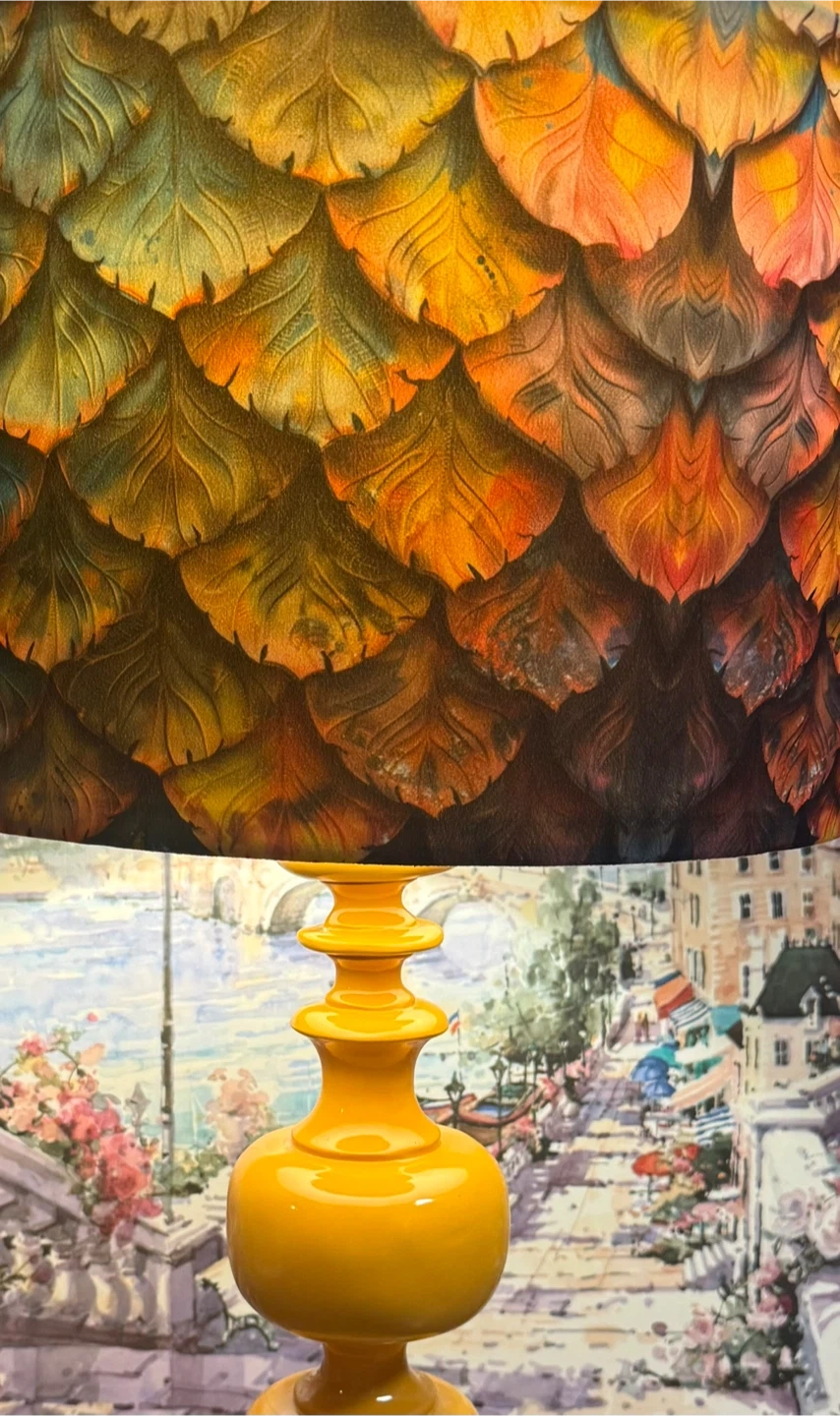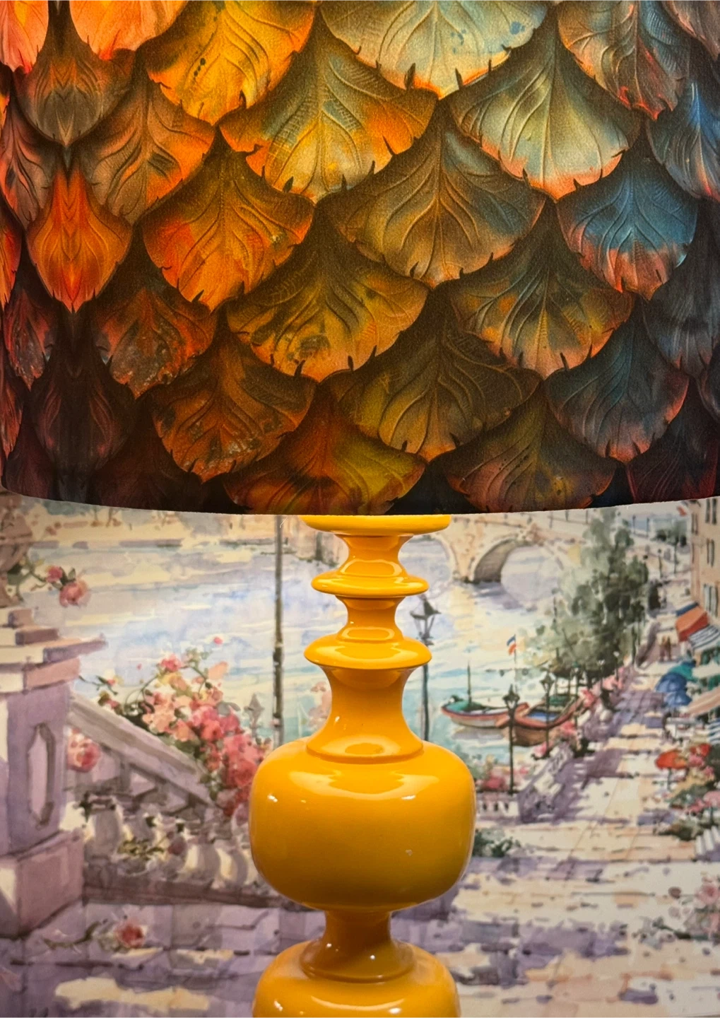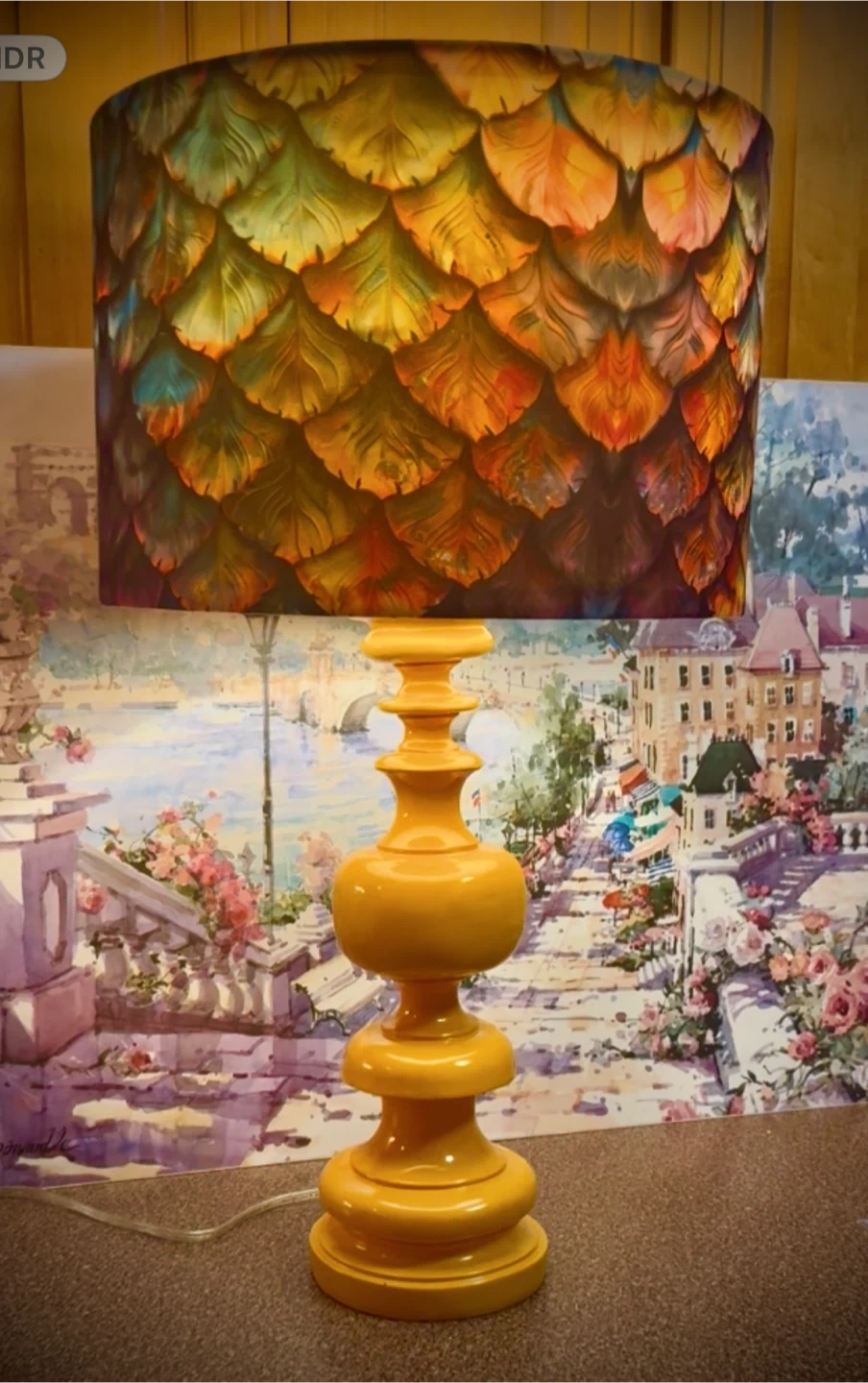 Here's a stylish colorful table lamp that will add a pop of color to any room! The shade features a unique and eye-catching pattern, making it a great statement piece for your home decor