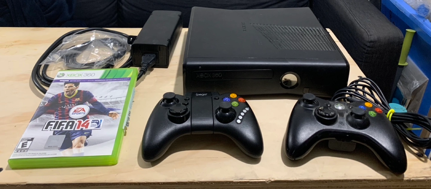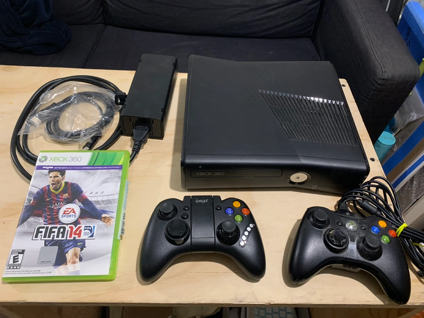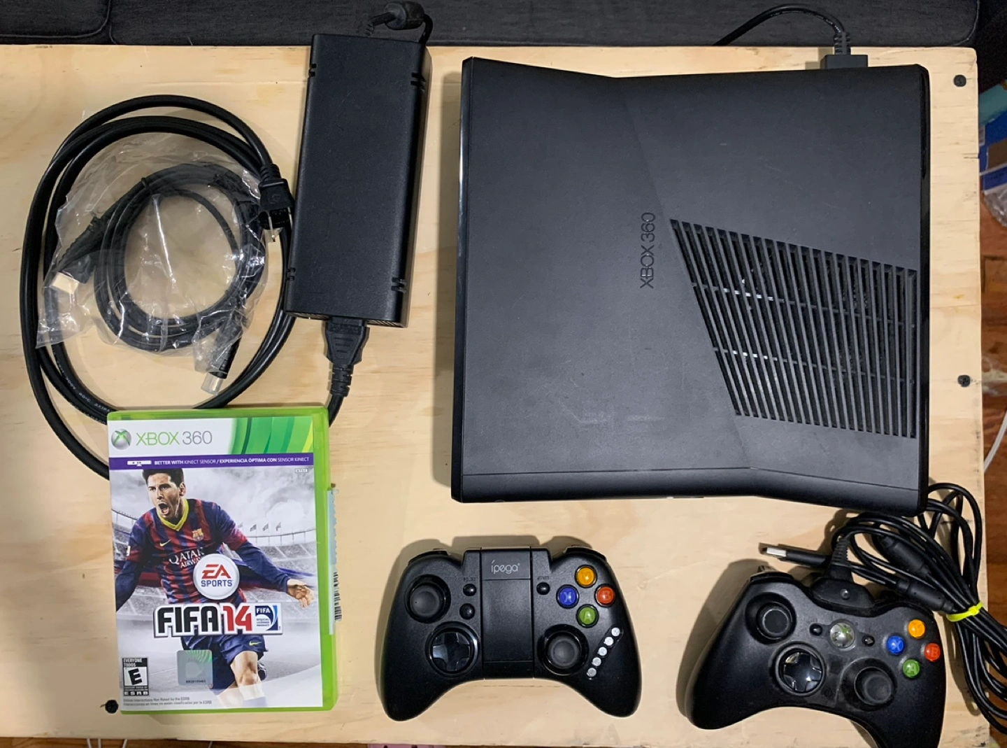 Xbox 360 console, power supply, two controllers, and FIFA 14 game. Includes cables. Great for gaming.