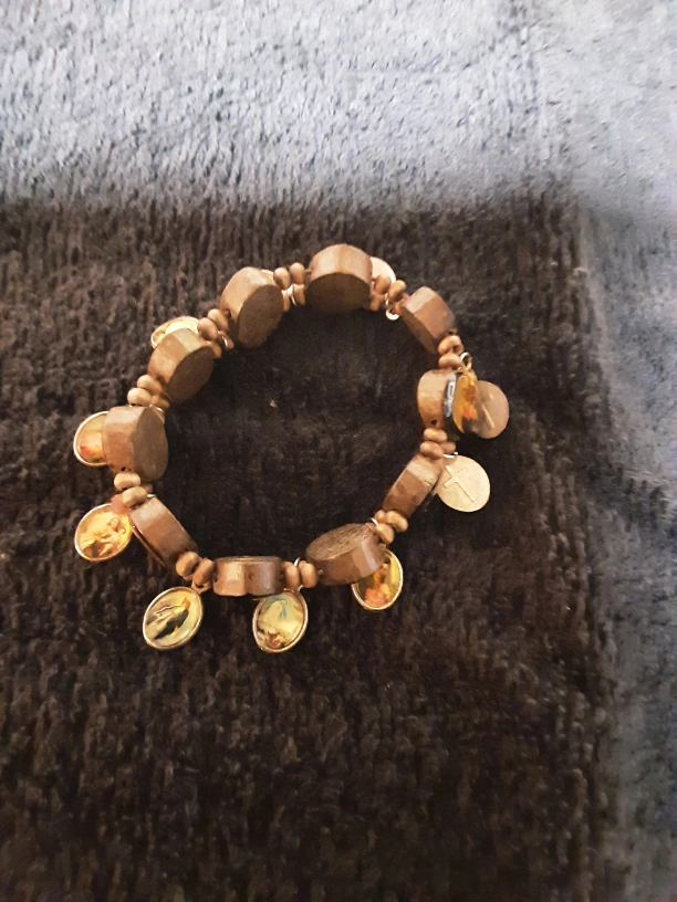 This is a beautiful wood bead bracelet. It features charms with religious imagery and a cross. This bracelet is perfect for adding a unique touch to your outfit!
