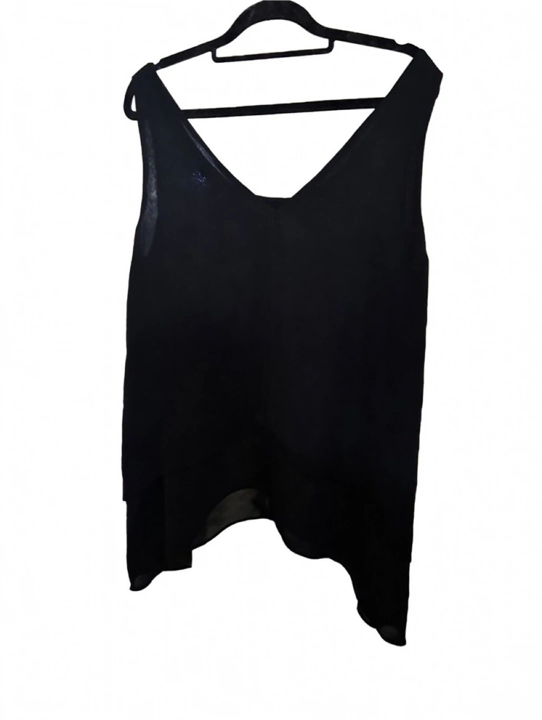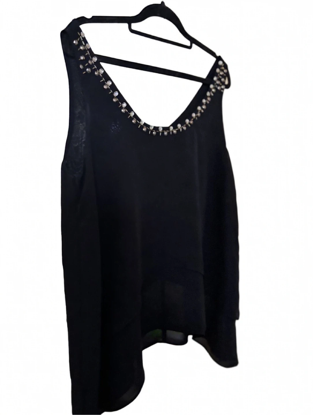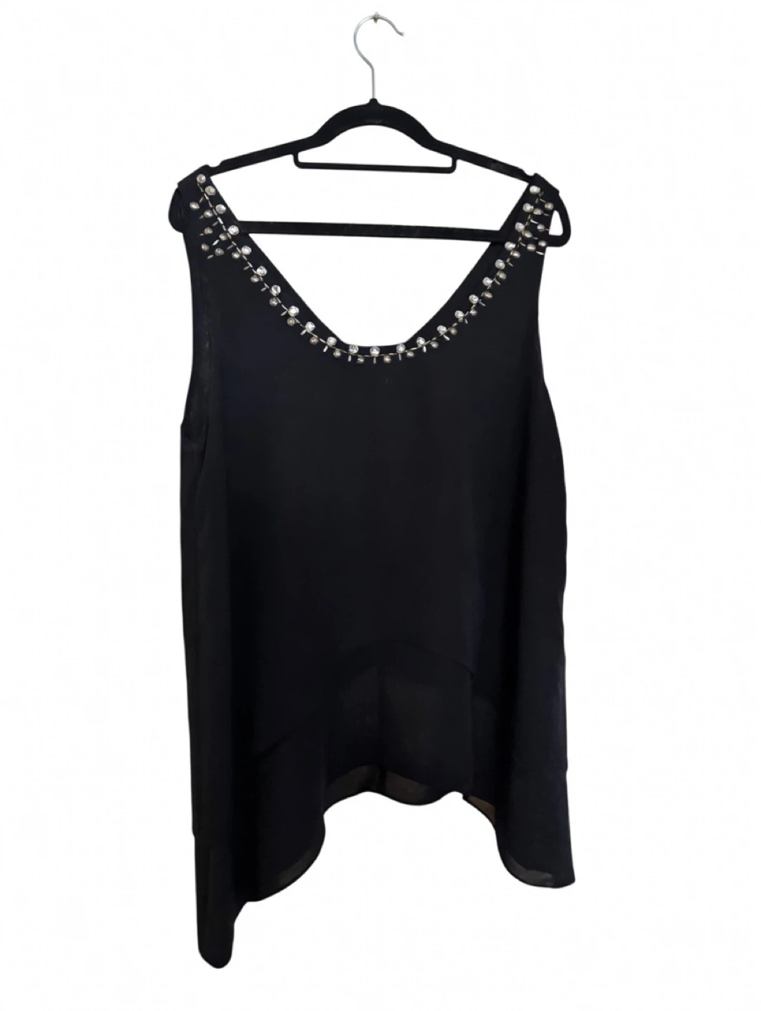Black sleeveless tank top with embellishments around the neckline. It has a V-neck and a layered hem. This top is made of a lightweight, flowy material.