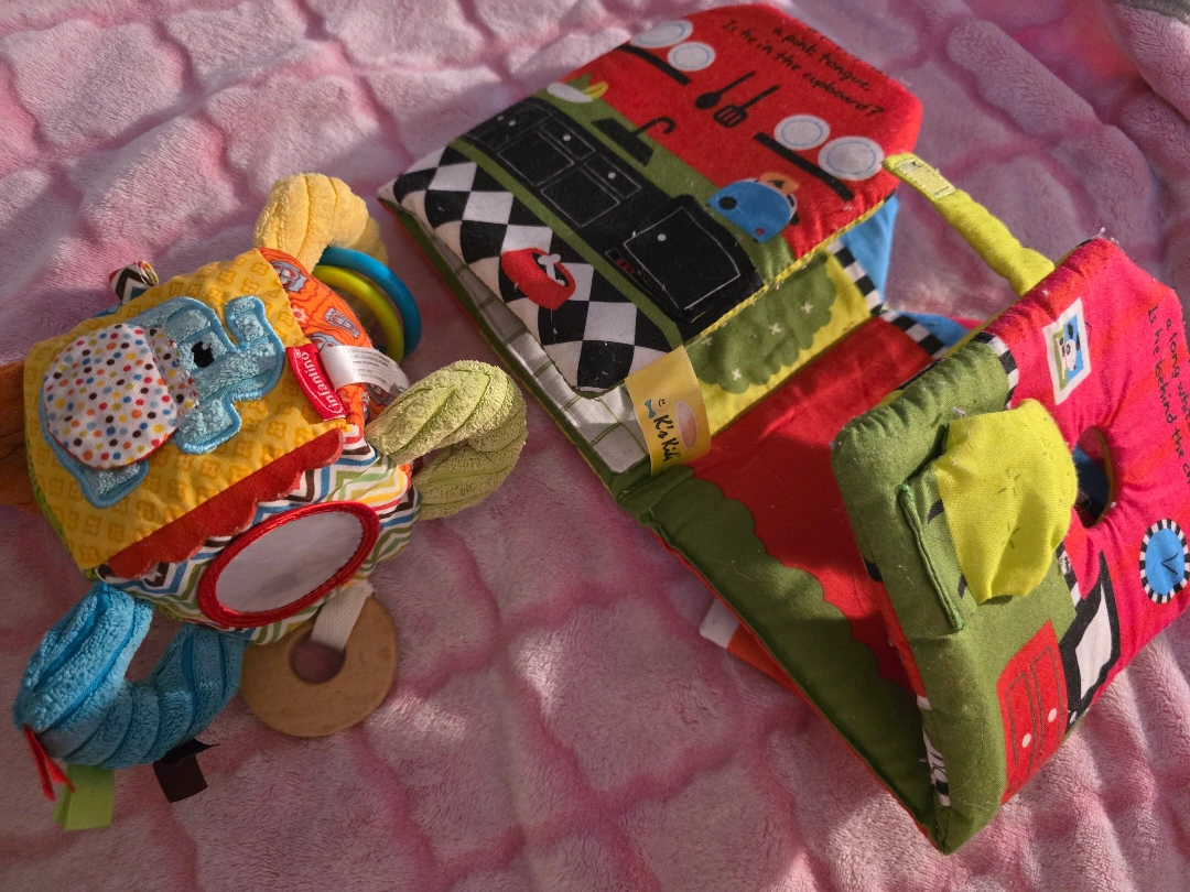 Adorable baby toy set. Includes soft fabric book and textured activity cube. Perfect for early development.