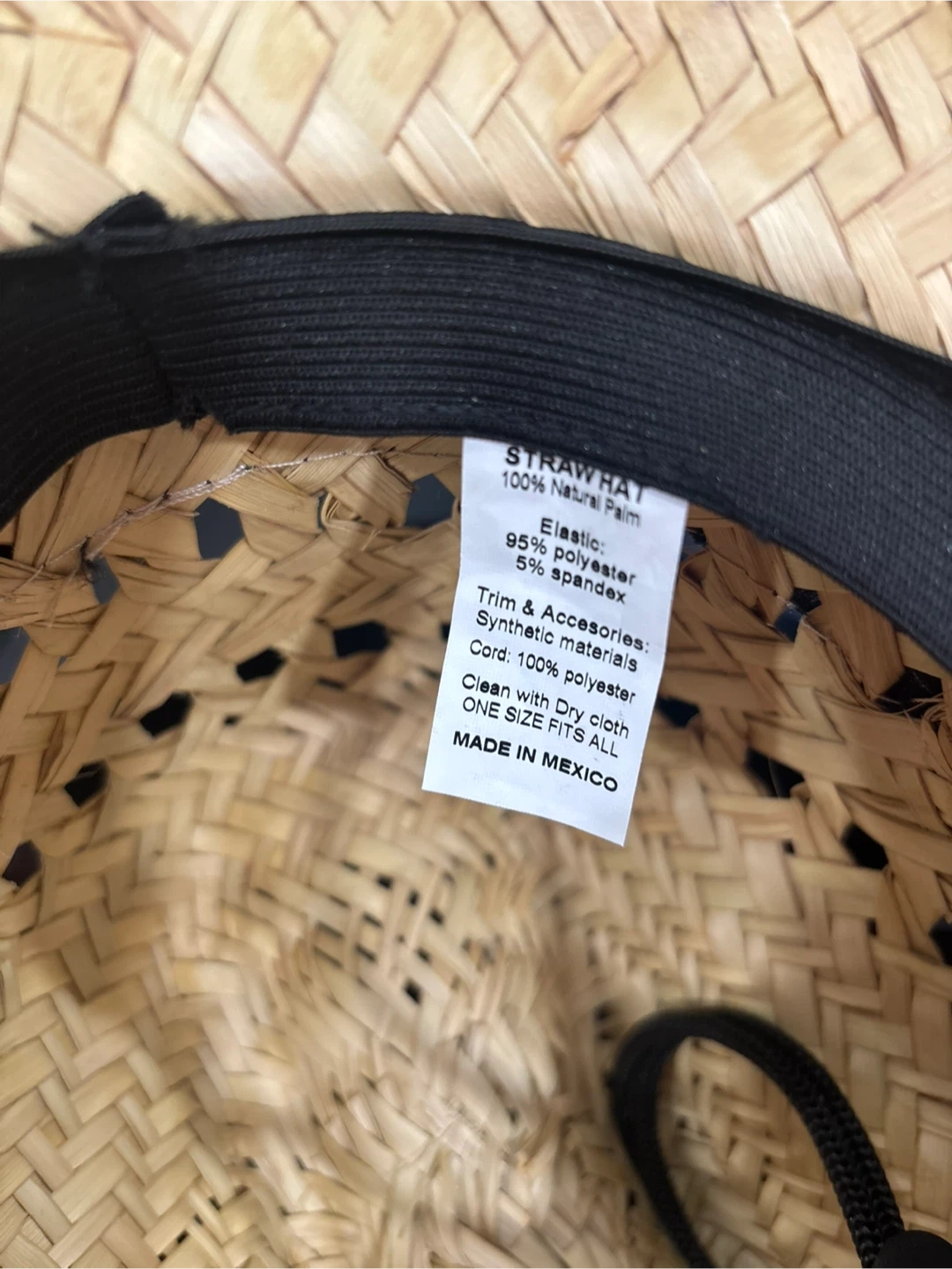 Selling a straw hat that's in great condition! It's made of 100% natural palm. The trim and accessories are synthetic materials, with elastic made of 95% polyester and 5% spandex. One size fits all!