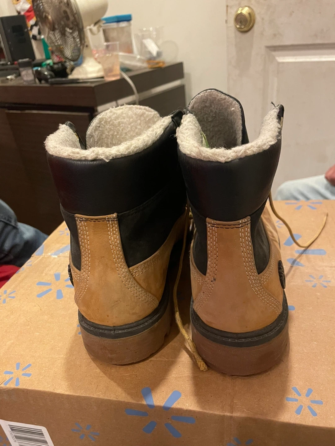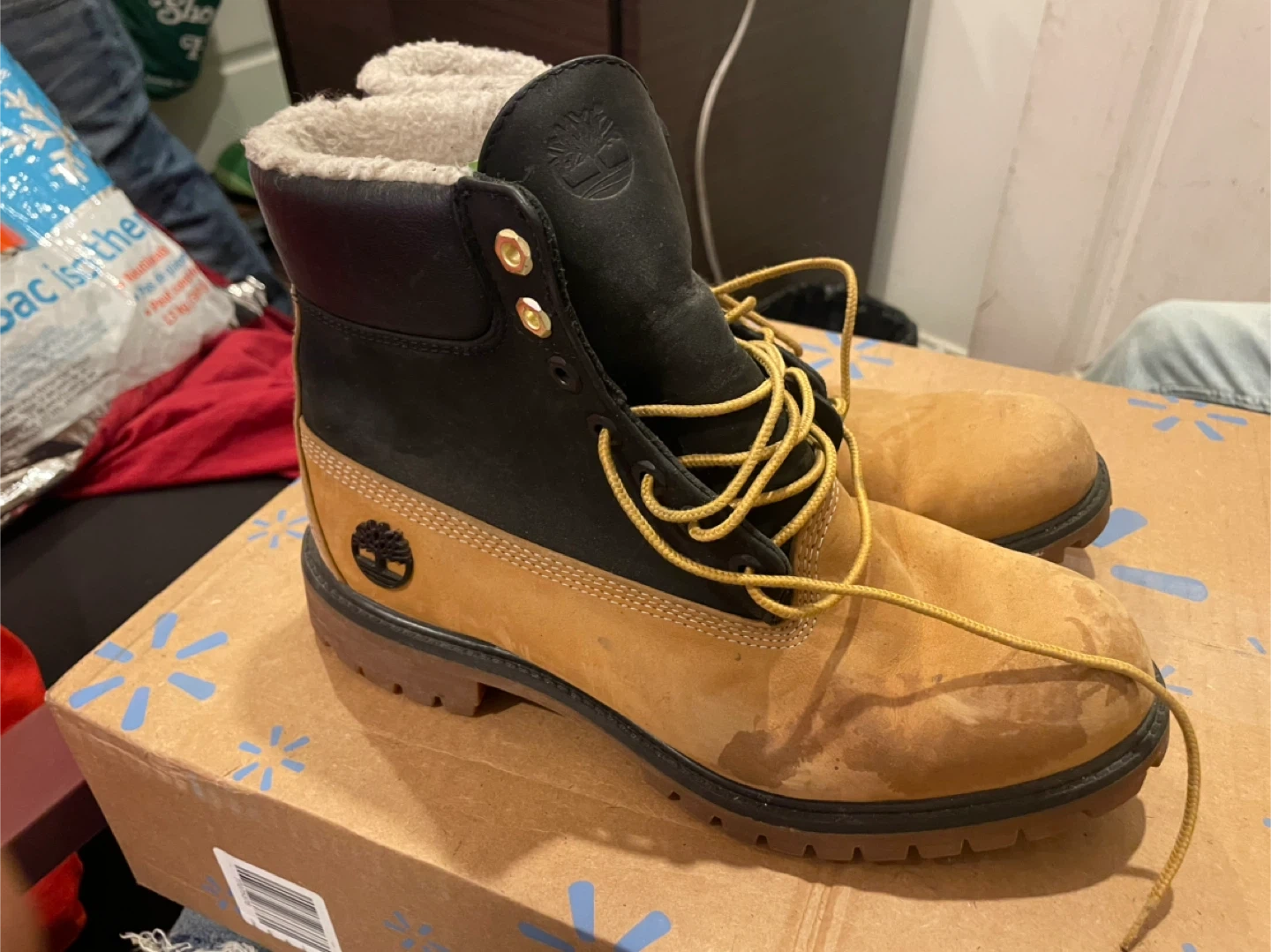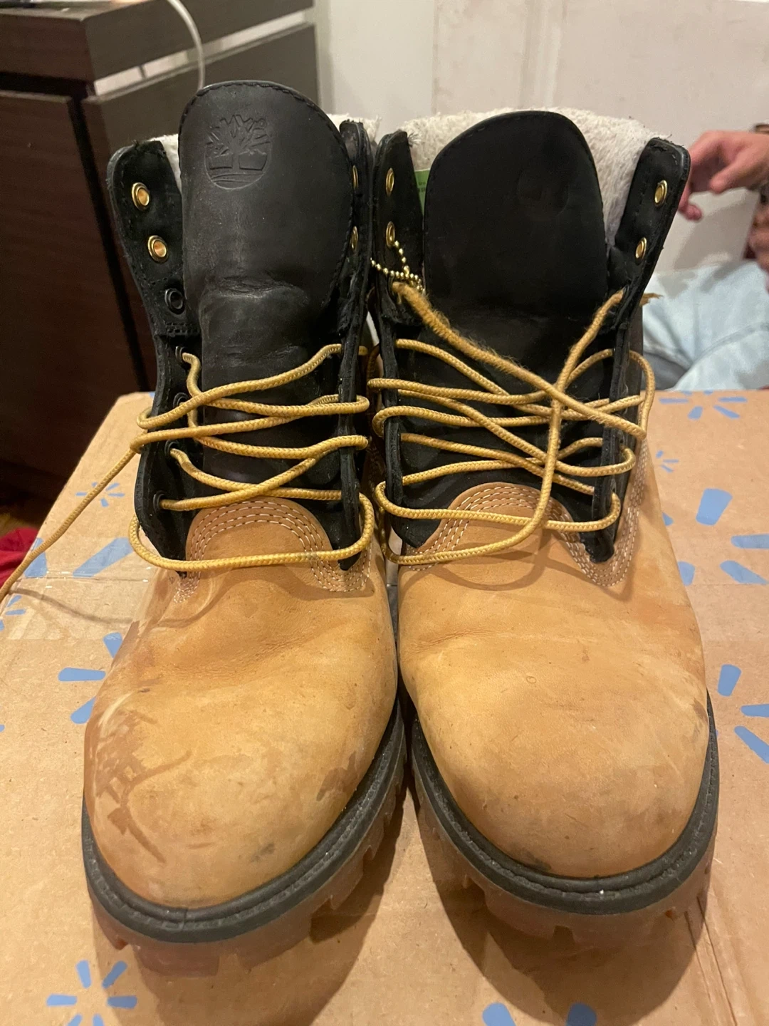 Selling a pair of Timberland waterproof leather boots! They are in good condition and ready for a new owner. These boots are a size 10 and feature a classic design with a tan and black color scheme. They are perfect for everyday wear or outdoor activities