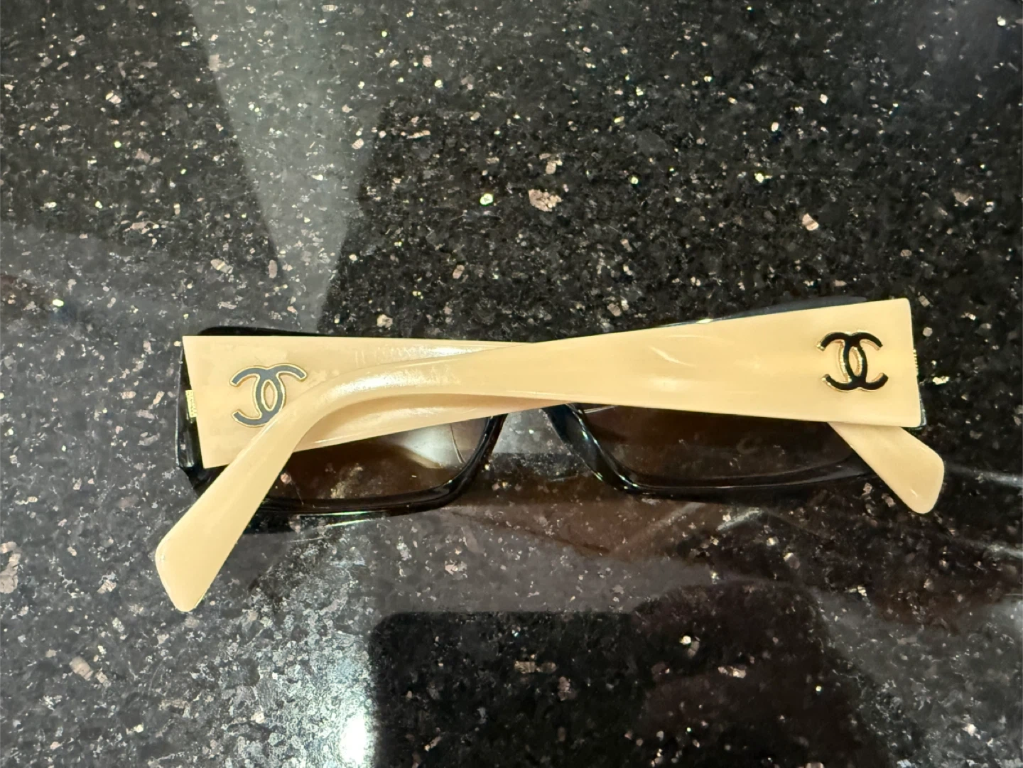 Elegant CHANEL sunglasses. Features the iconic CC logo on the sides. Classic black and beige frame with tinted lenses. A stylish accessory for sunny days!