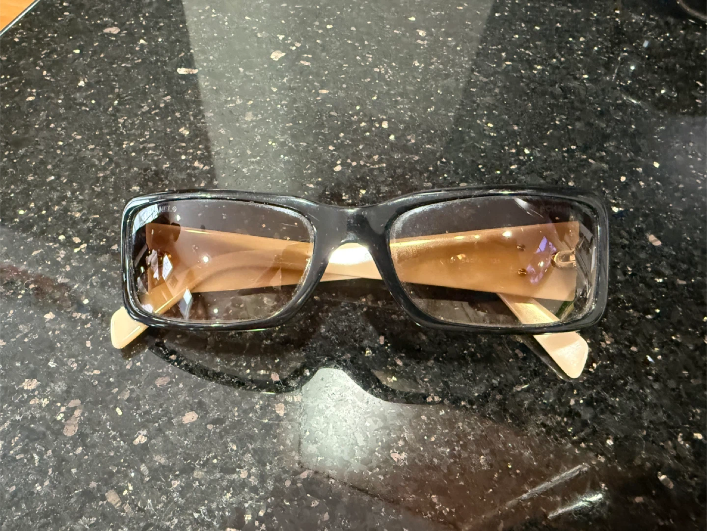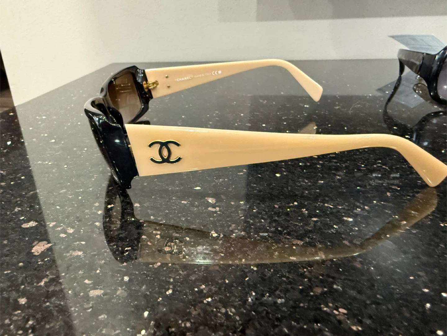 Elegant CHANEL sunglasses. Features the iconic CC logo on the sides. Classic black and beige frame with tinted lenses. A stylish accessory for sunny days!