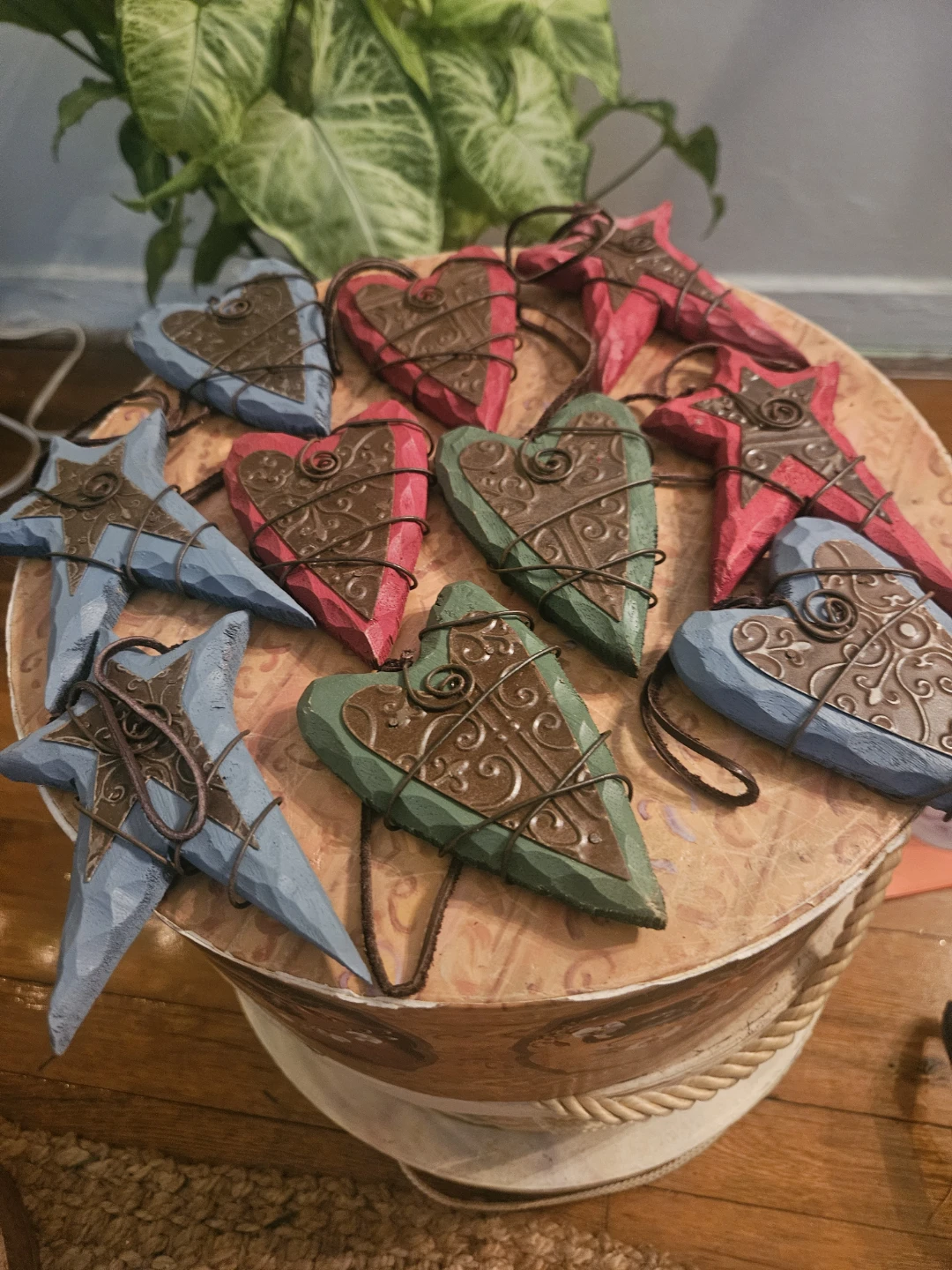 These handcrafted wooden ornaments are so cute! There are hearts and stars in various colors. They have a rustic look with a wire-wrapped design and carved details. Add a touch of charm to your home decor with these unique pieces