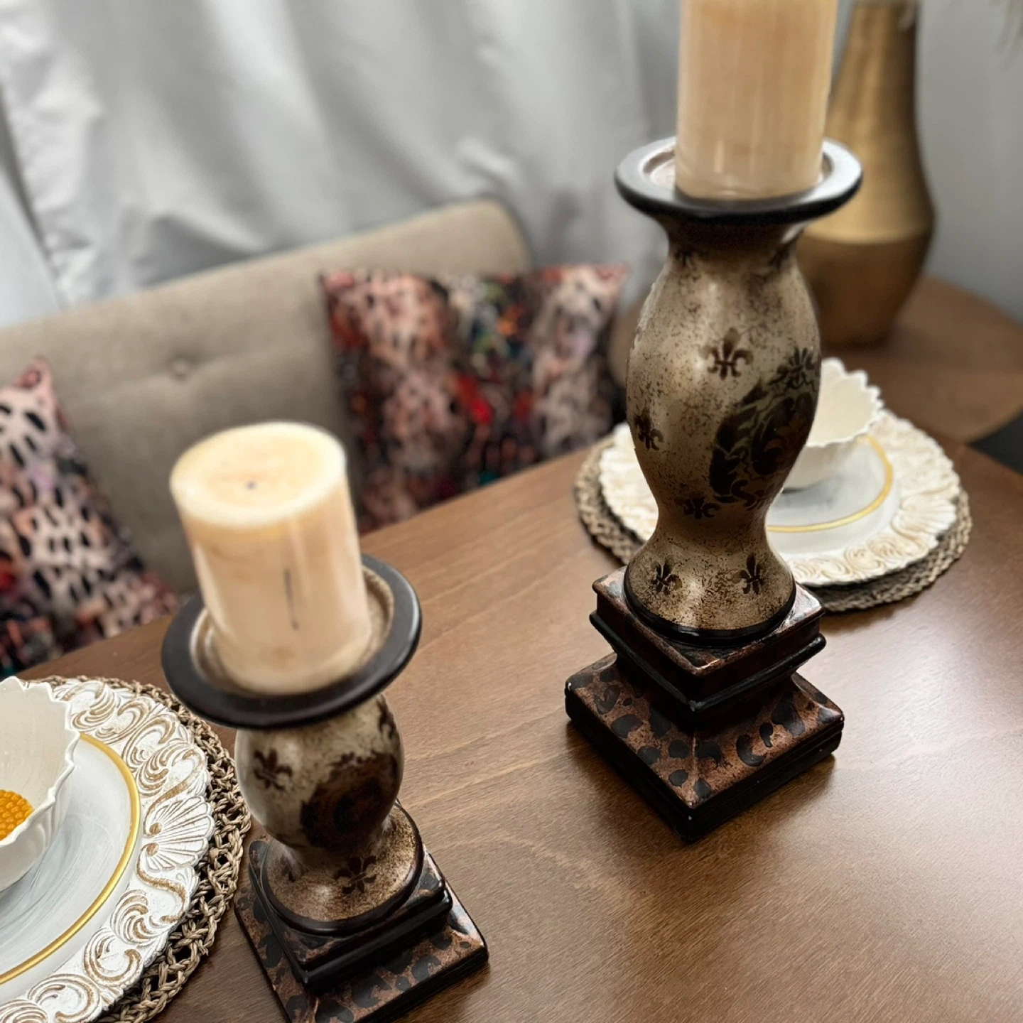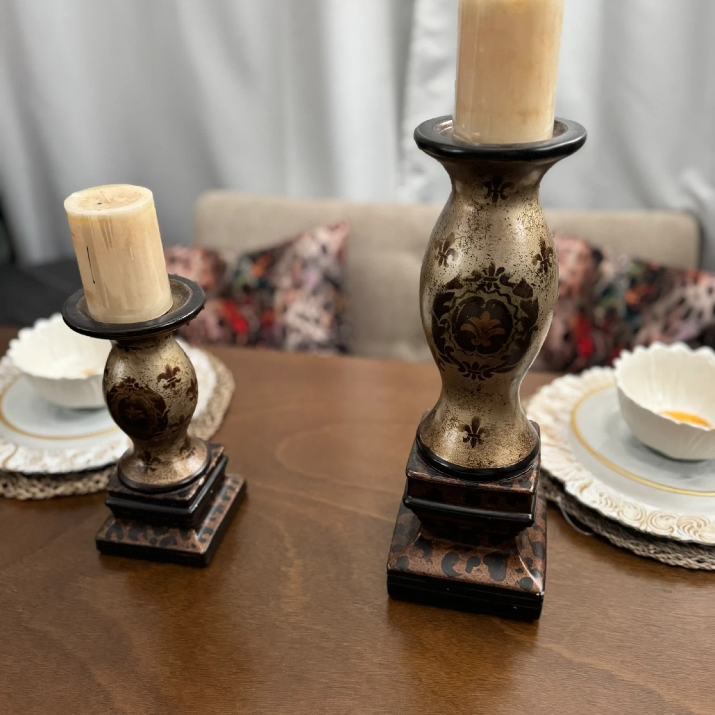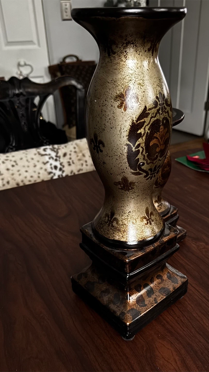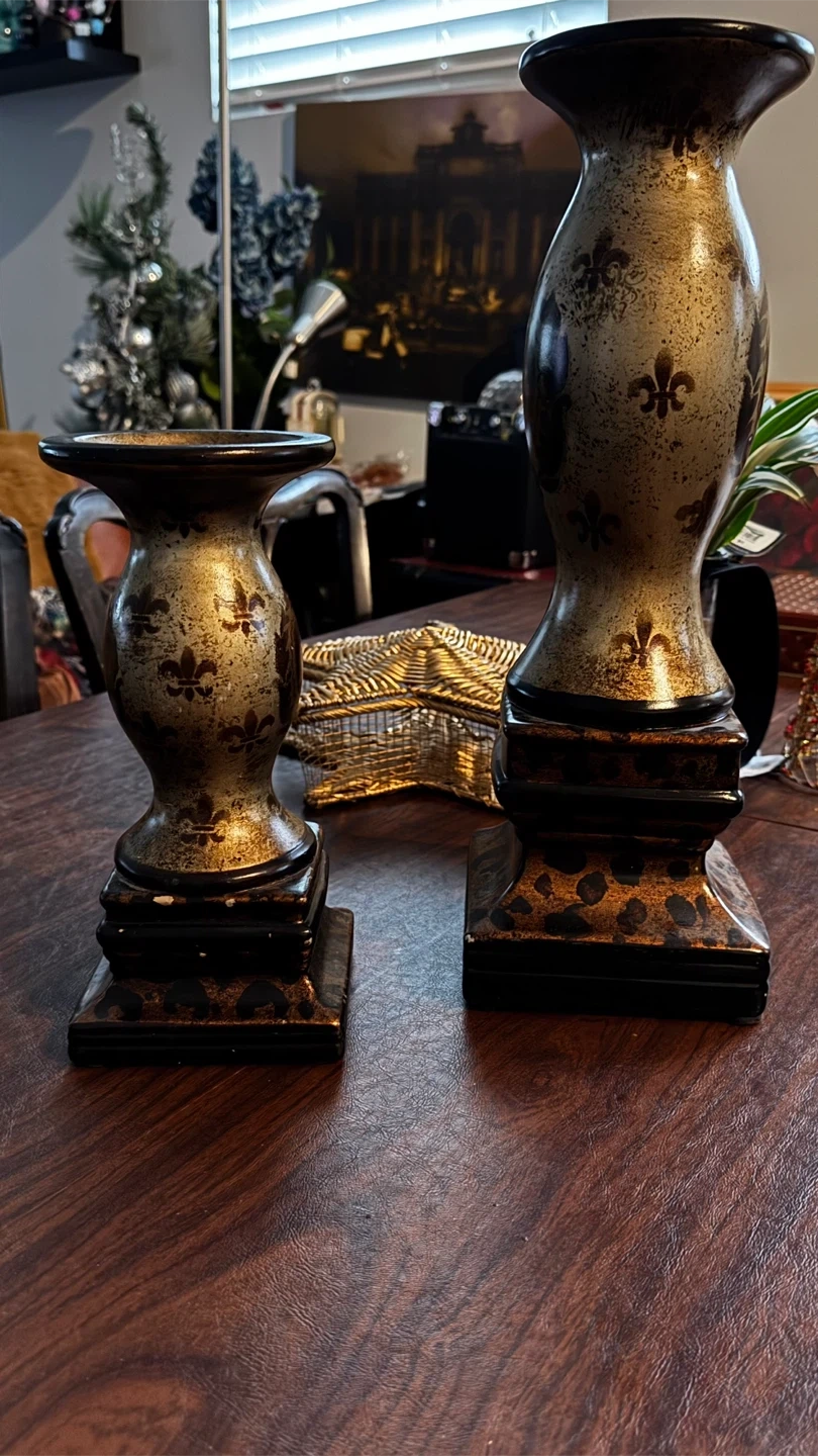 Selling a set of decorative candle holders. They have a unique design with fleur-de-lis accents and a black and gold color scheme. Perfect for adding a touch of elegance to any room