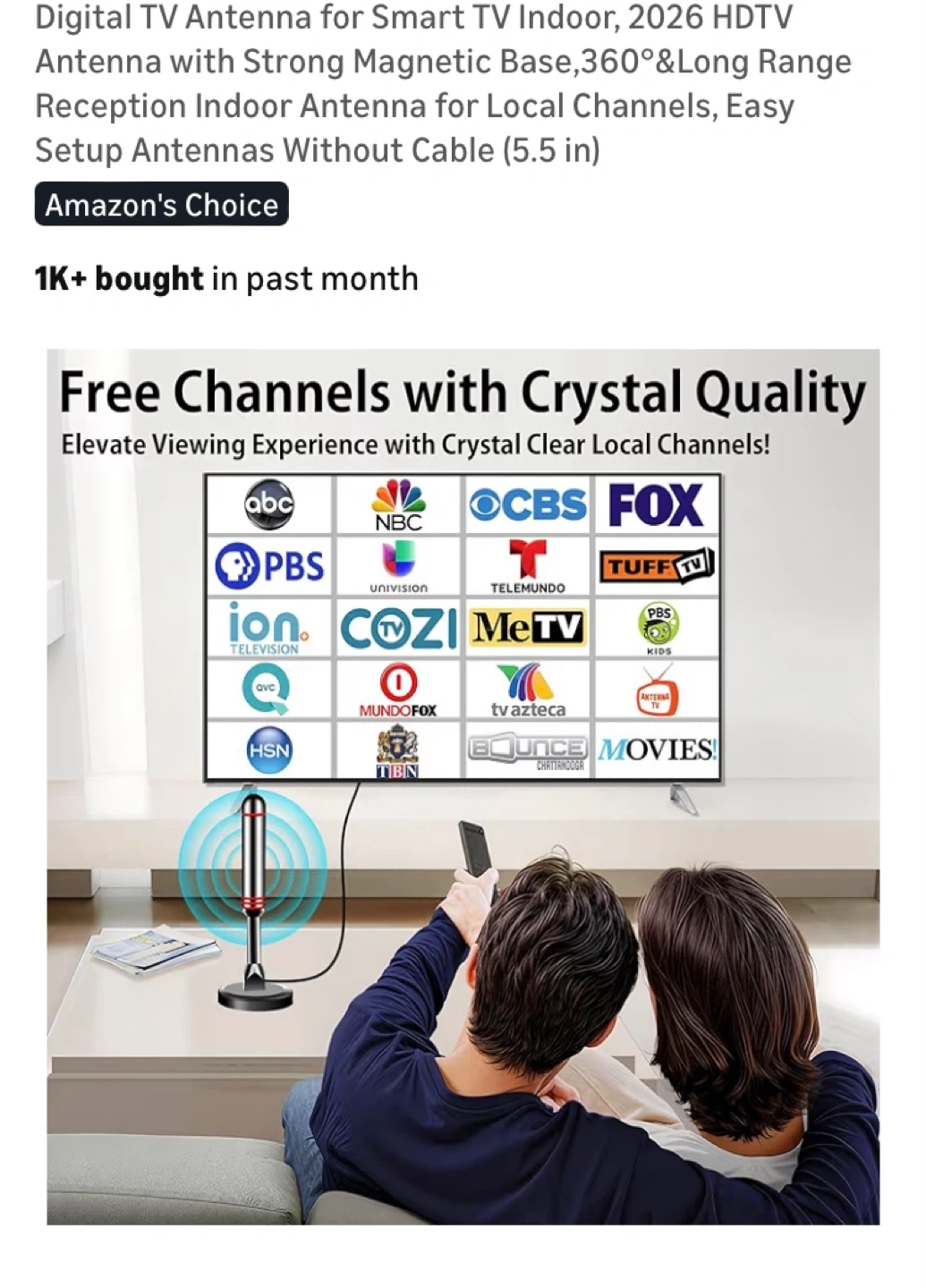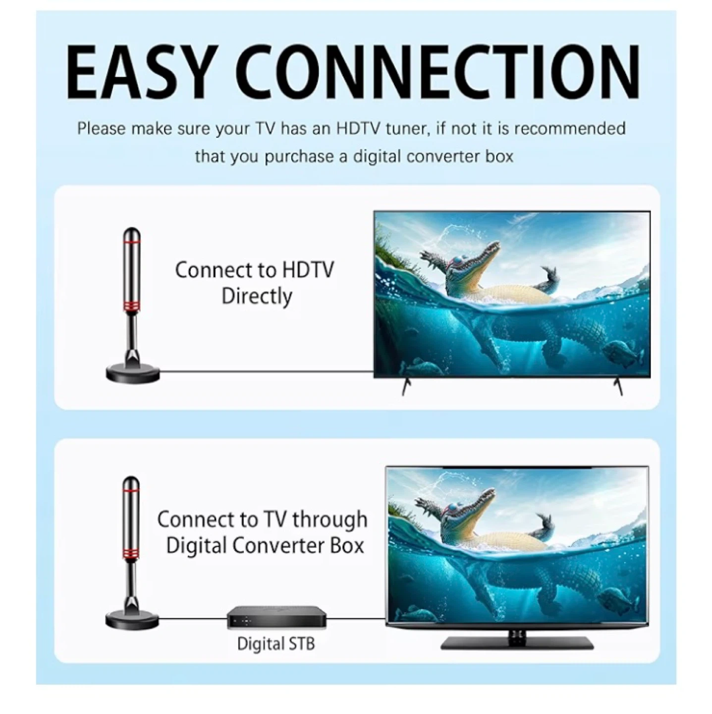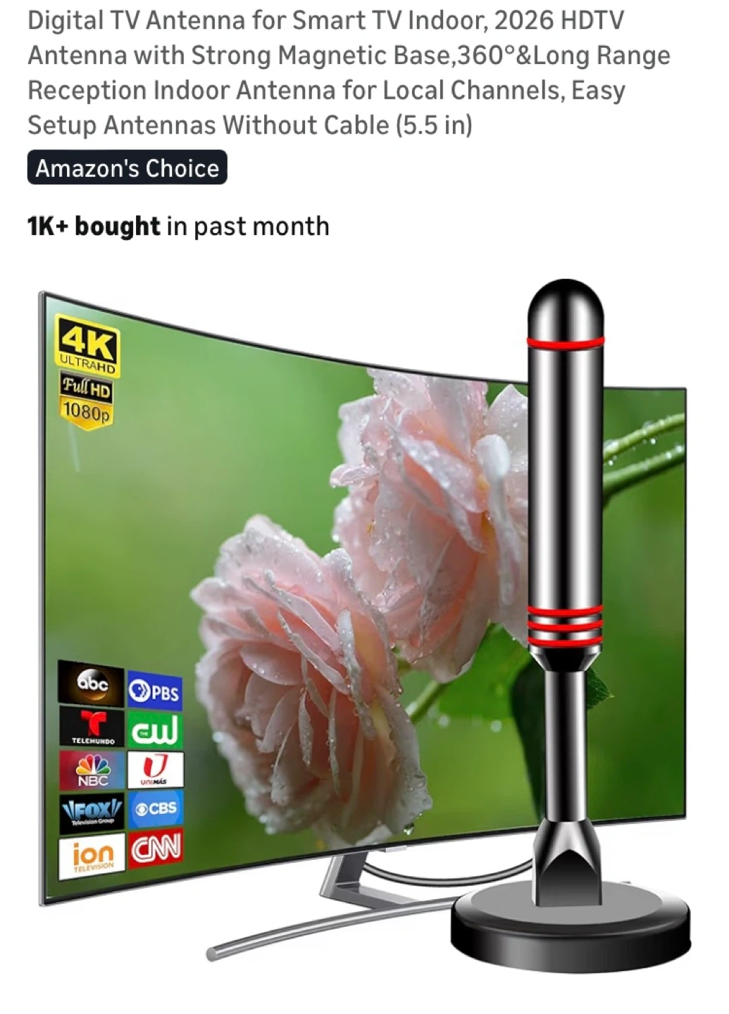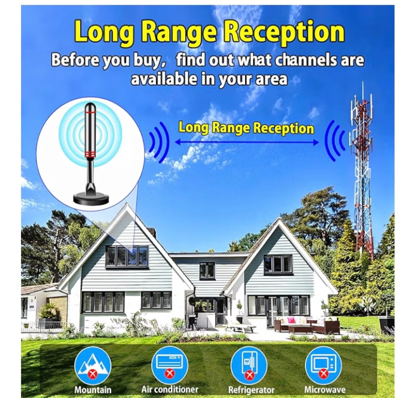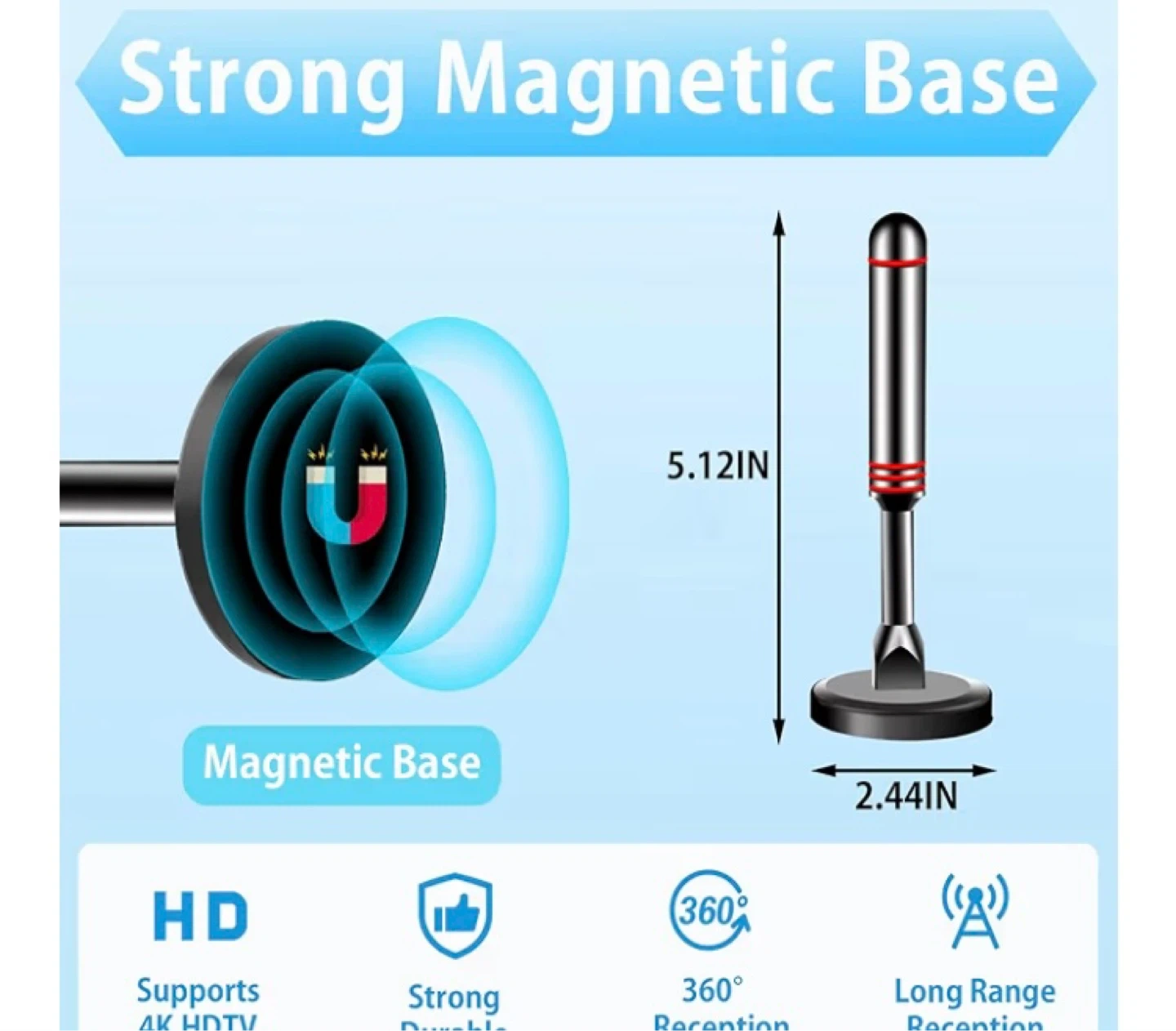 This digital TV antenna supports 4K UHD and HDTV. It features a strong magnetic base and long-range reception for local channels. Easy setup without a cable is included.