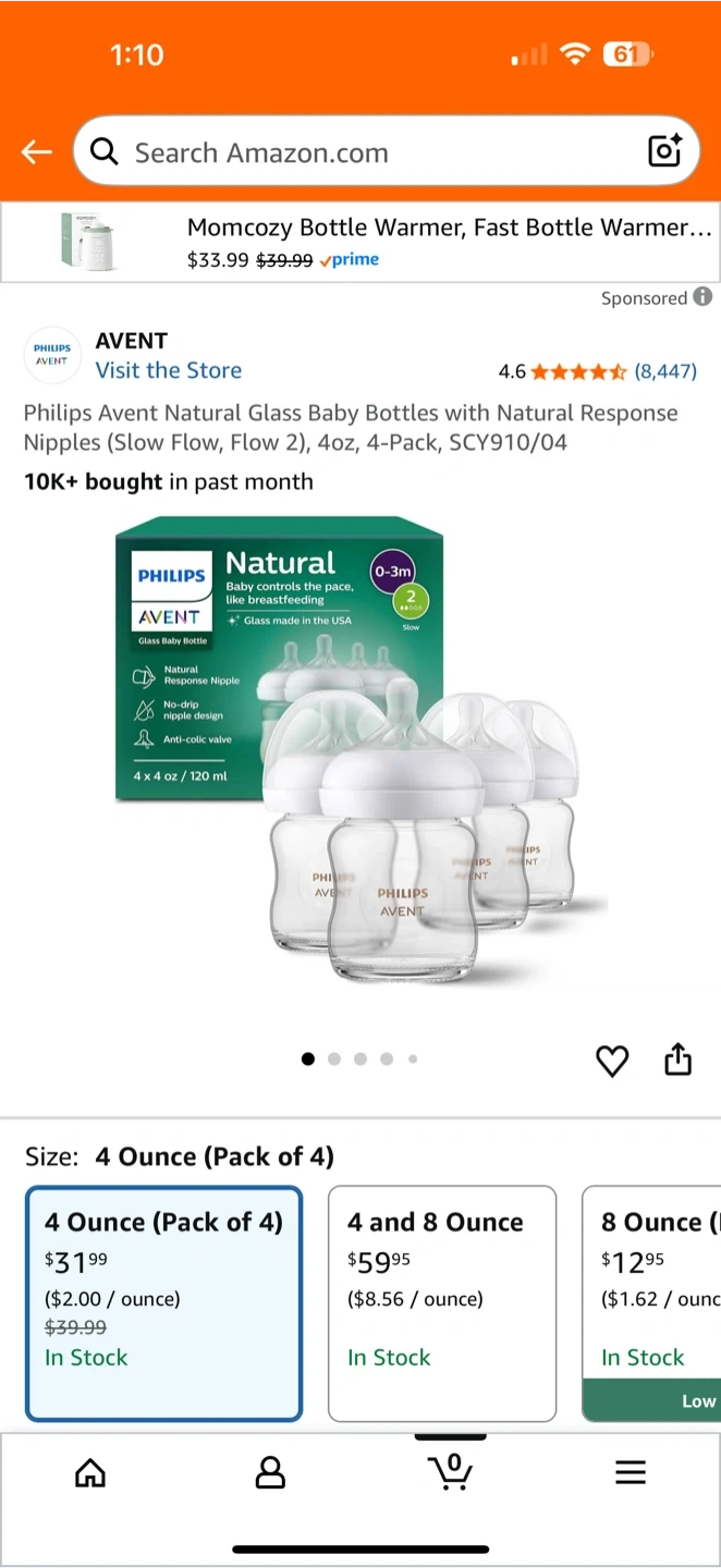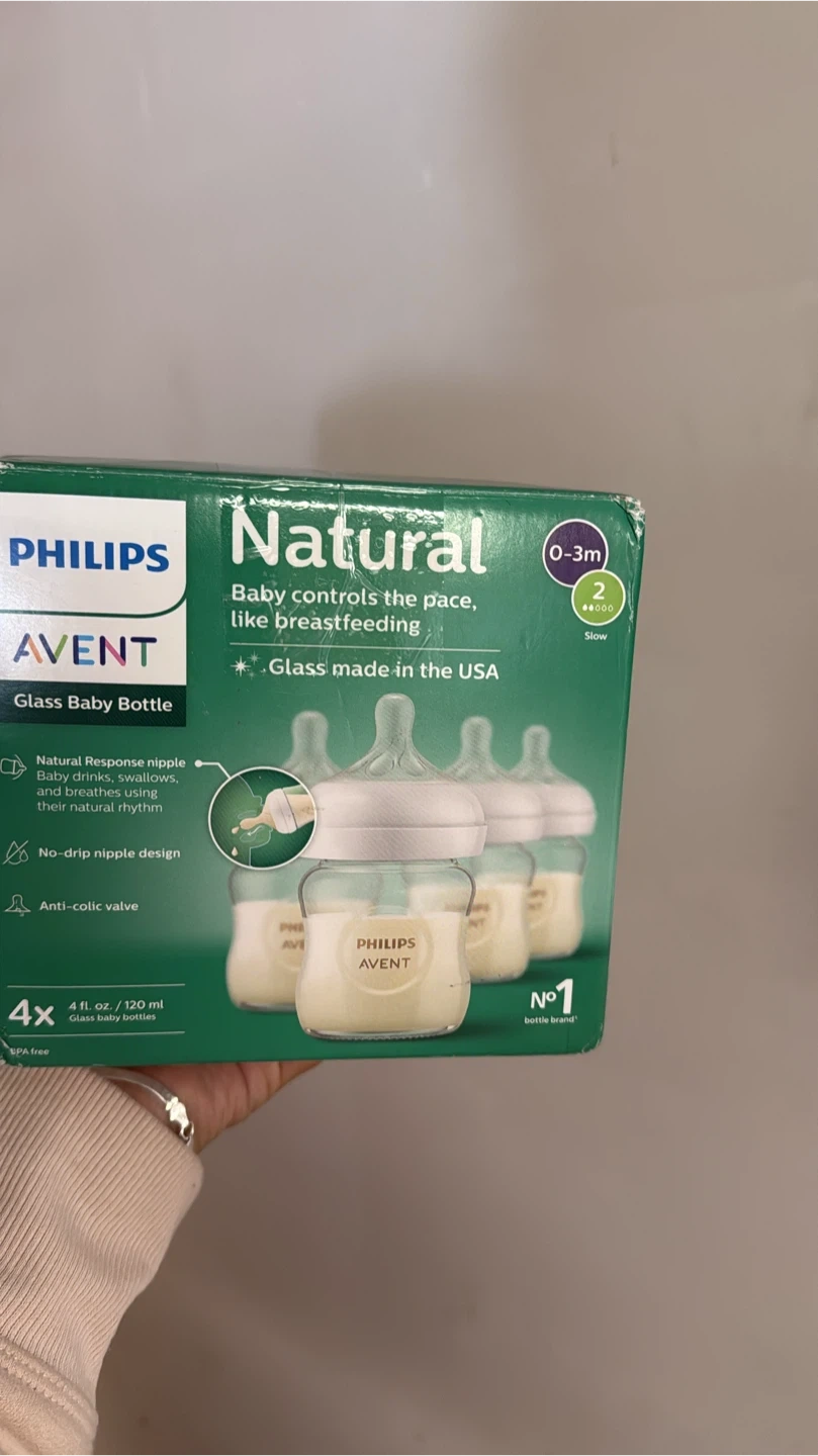 Selling a set of Philips Avent Natural Glass Baby Bottles. This is a 4-pack, with each bottle holding 4 ounces. They are designed with a Natural Response Nipple to help babies drink at their own pace, similar to breastfeeding, and feature an anti-colic valve. Great for newborns to 3-month-olds!