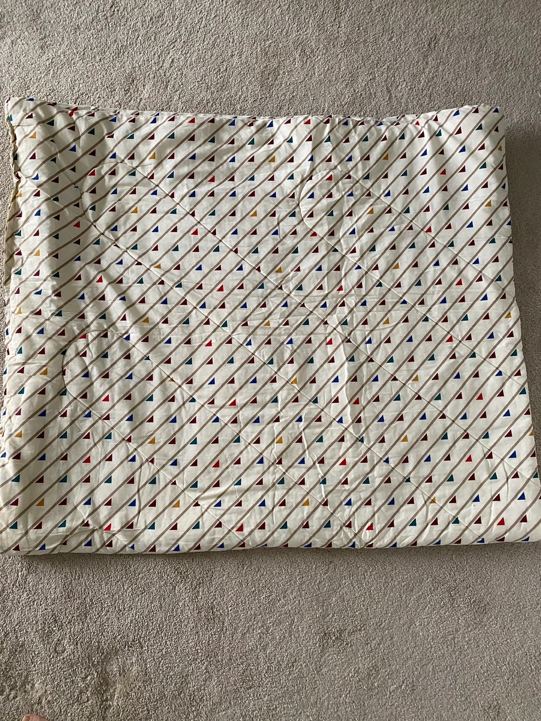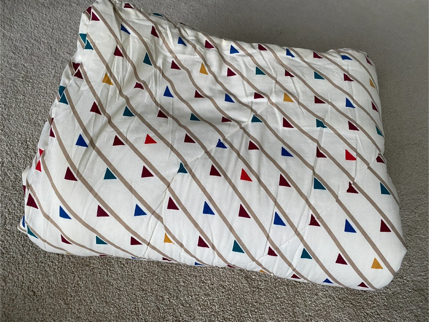 Full size comforter featuring a repeating pattern of diagonal brown stripes with red, blue, green, and yellow triangles. Full size: 96 x 86 inches. The material feels soft and is machine washable.