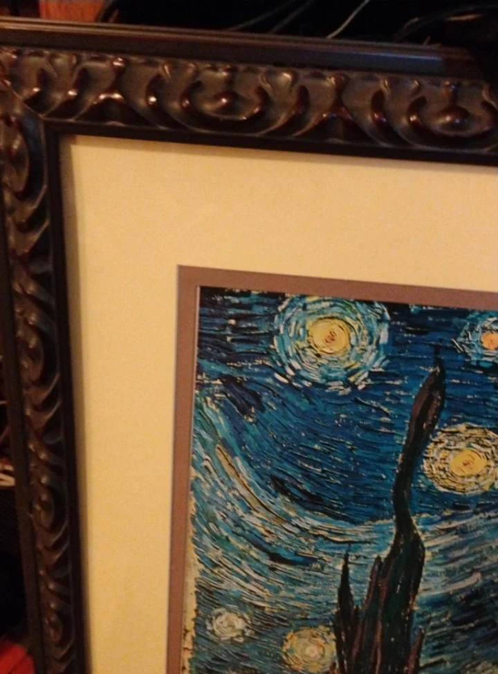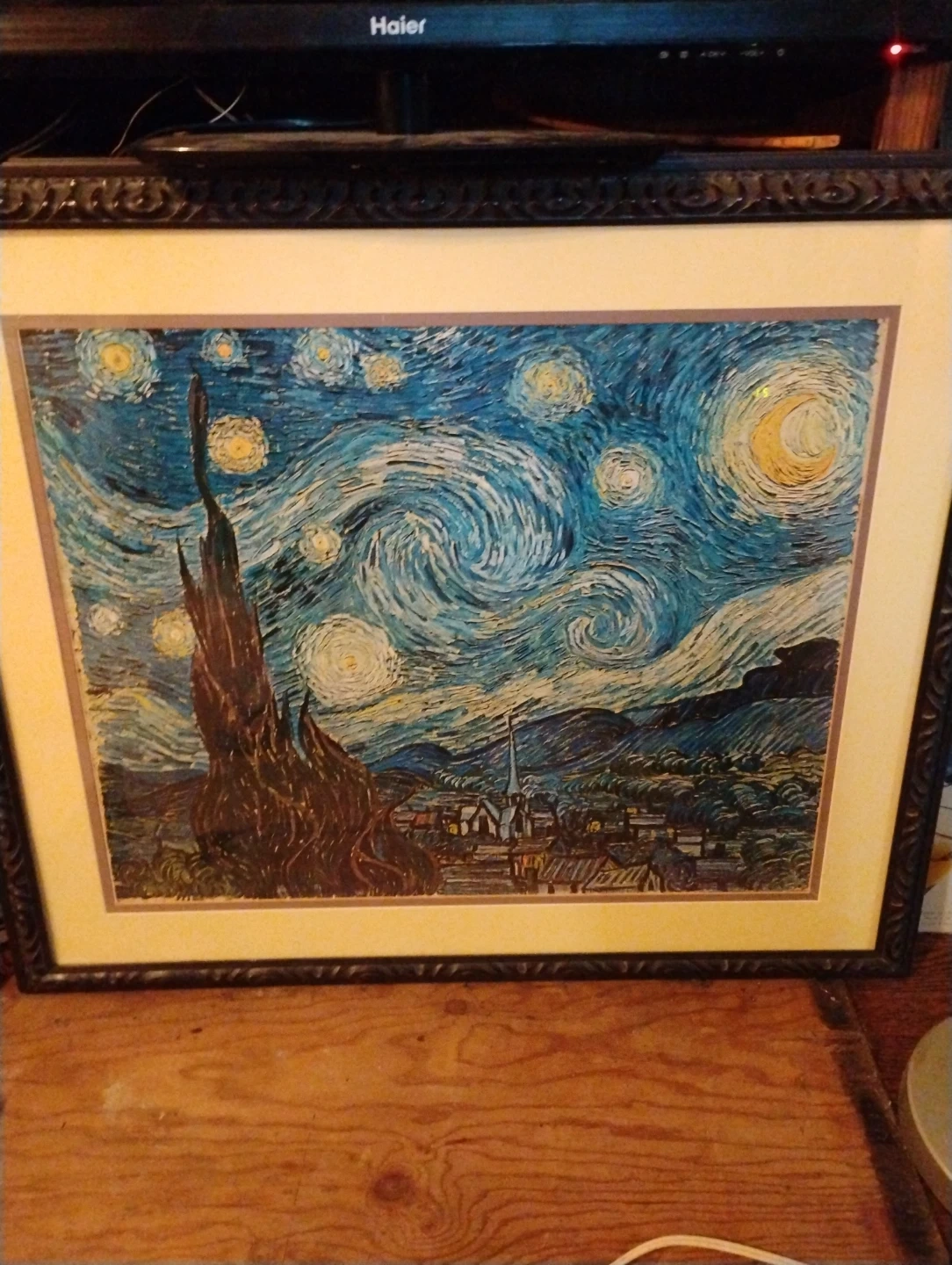Framed print of Vincent van Gogh's "The Starry Night." This iconic artwork depicts a swirling night sky over a village. The print is housed in a dark, decorative frame with a cream-colored mat. It's a beautiful piece for any art enthusiast!