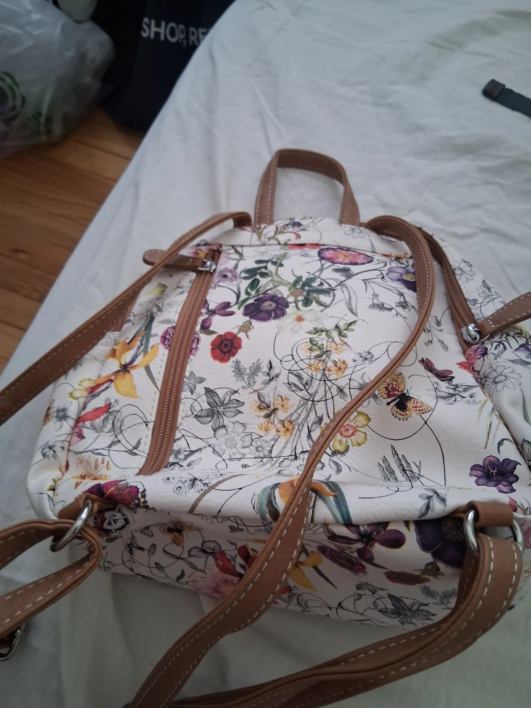 This is a cute mini backpack with a beautiful floral pattern. It's got faux leather trim and adjustable straps. It's perfect for carrying essentials on a day out!